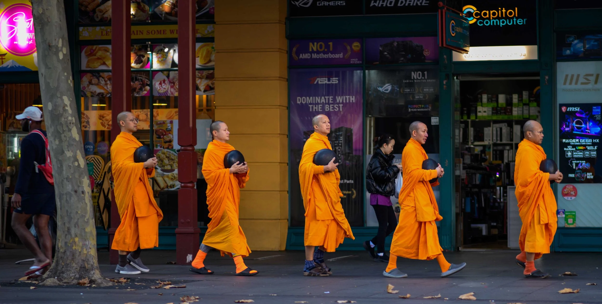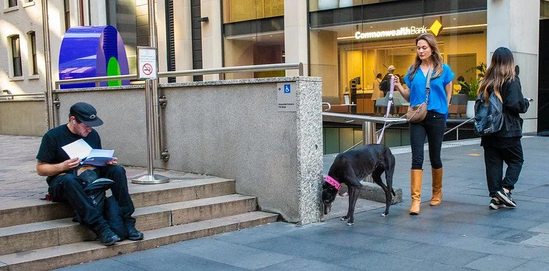 A young man sitting on stairs reading a book, a woman walking her black dog with a pink collar, and two women walking on a city sidewalk in front of a Commonwealth Bank branch.