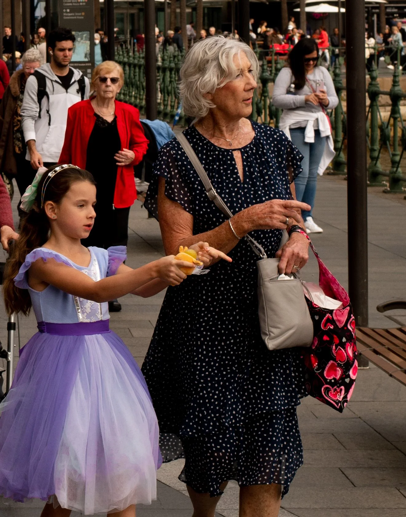 A young girl in a purple dress holding a yellow object, walking with an elderly woman in a black polka-dot dress in a crowded outdoor area.