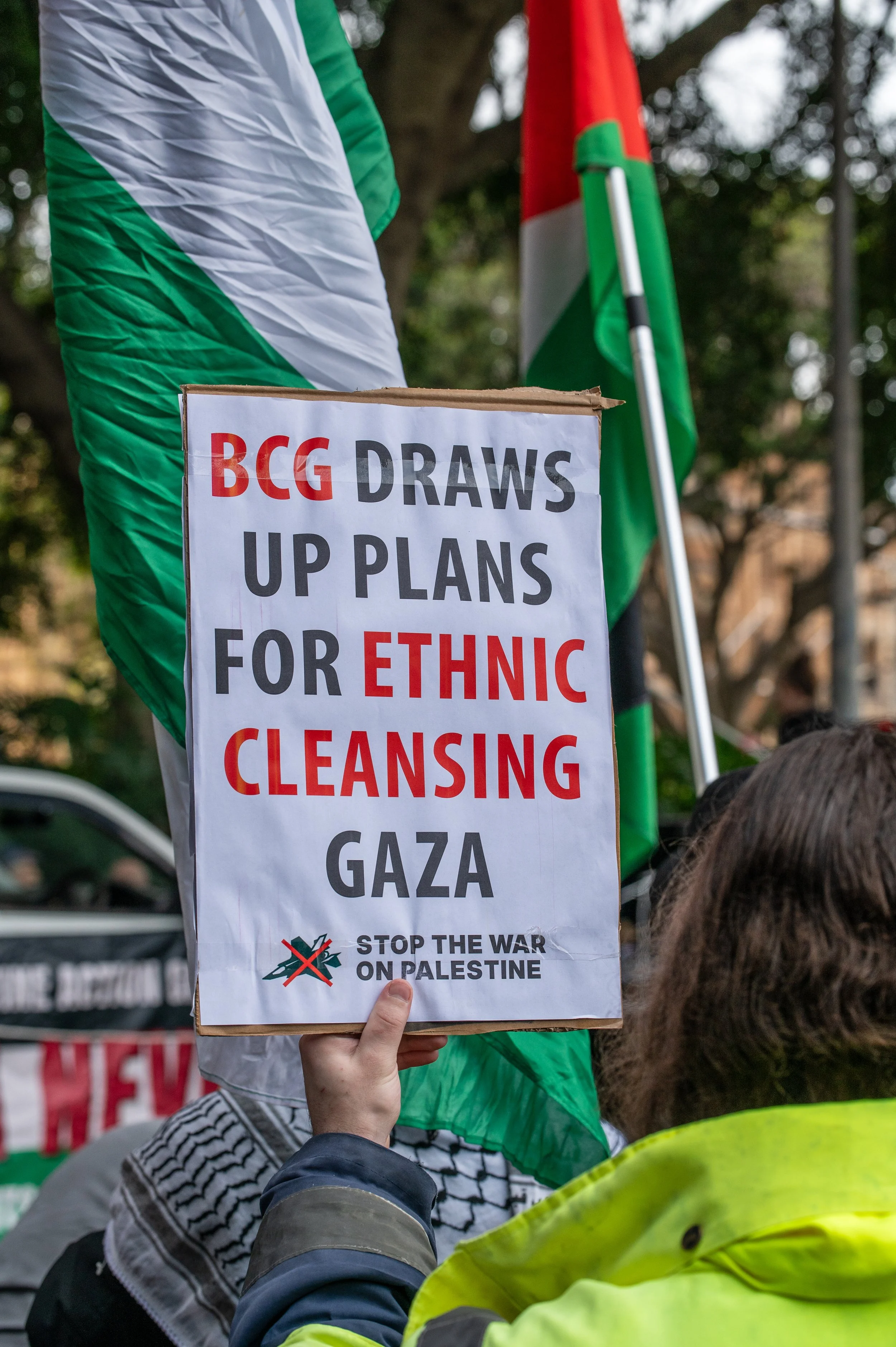 A protest sign held up among a crowd, reading: "BCG DRAWS UP PLANS FOR ETHNIC CLEANSING GAZA," with a crossed-out Palestinian flag and the message "STOP THE WAR ON PALESTINE."