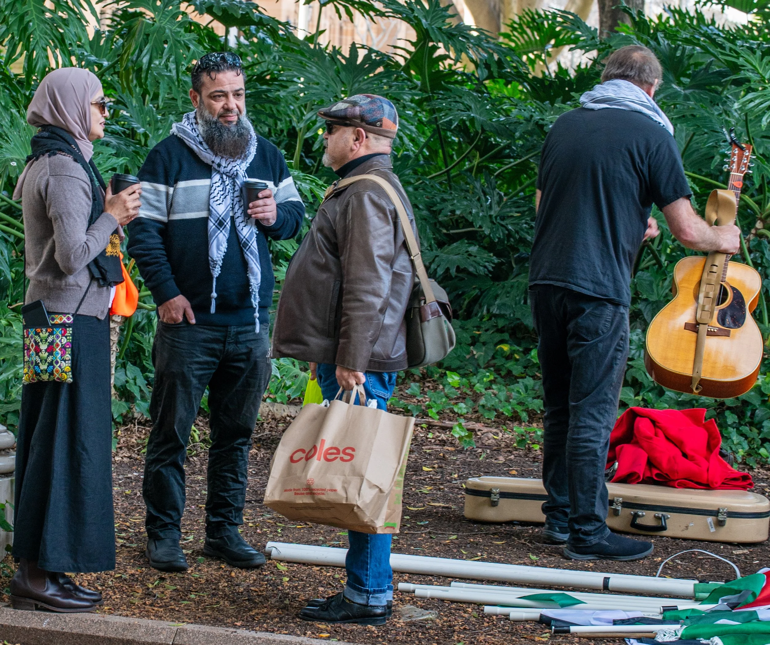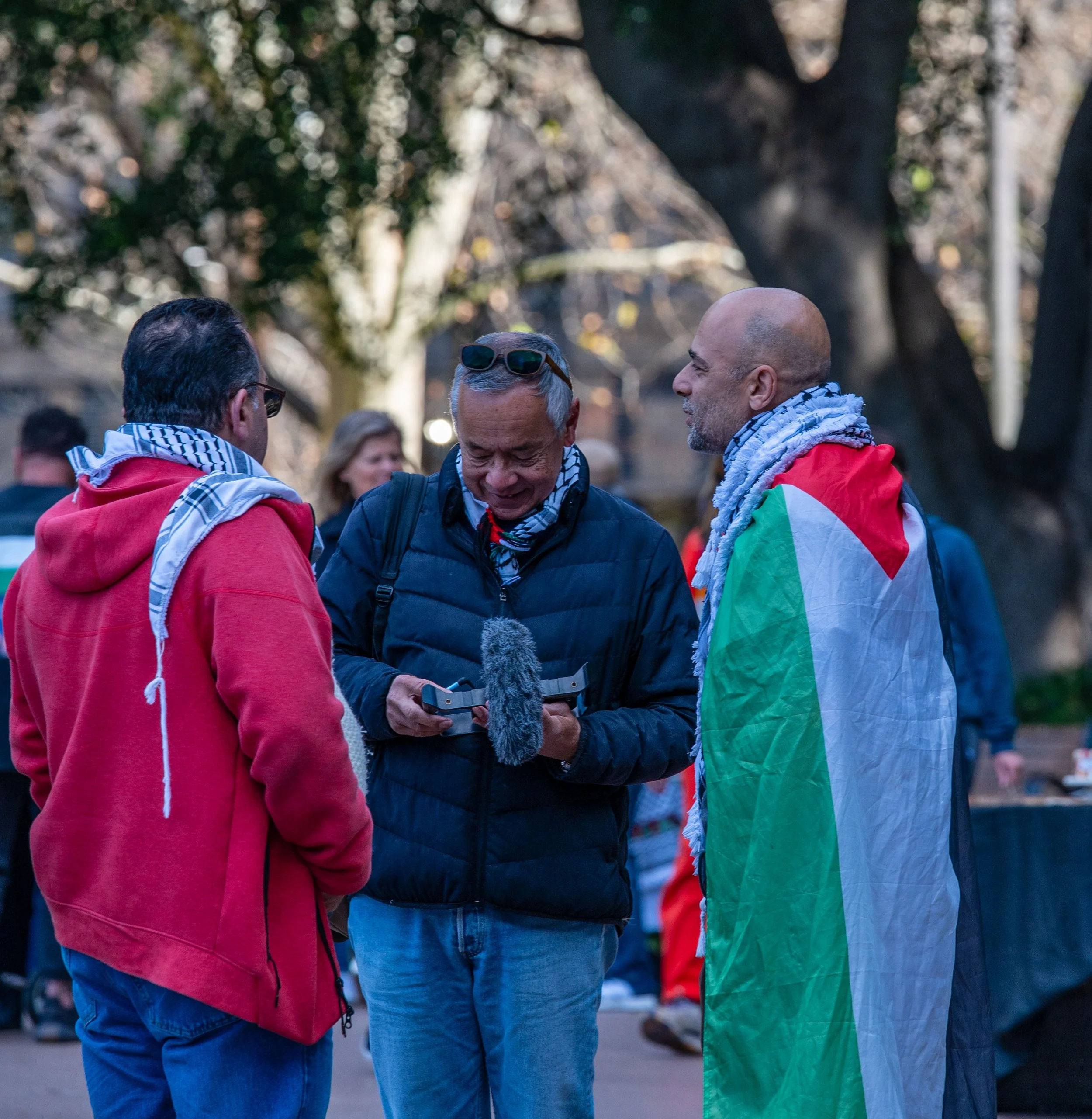 Three people engaged in conversation at a protest or rally, with Palestinian flags and merchandise visible in the background.