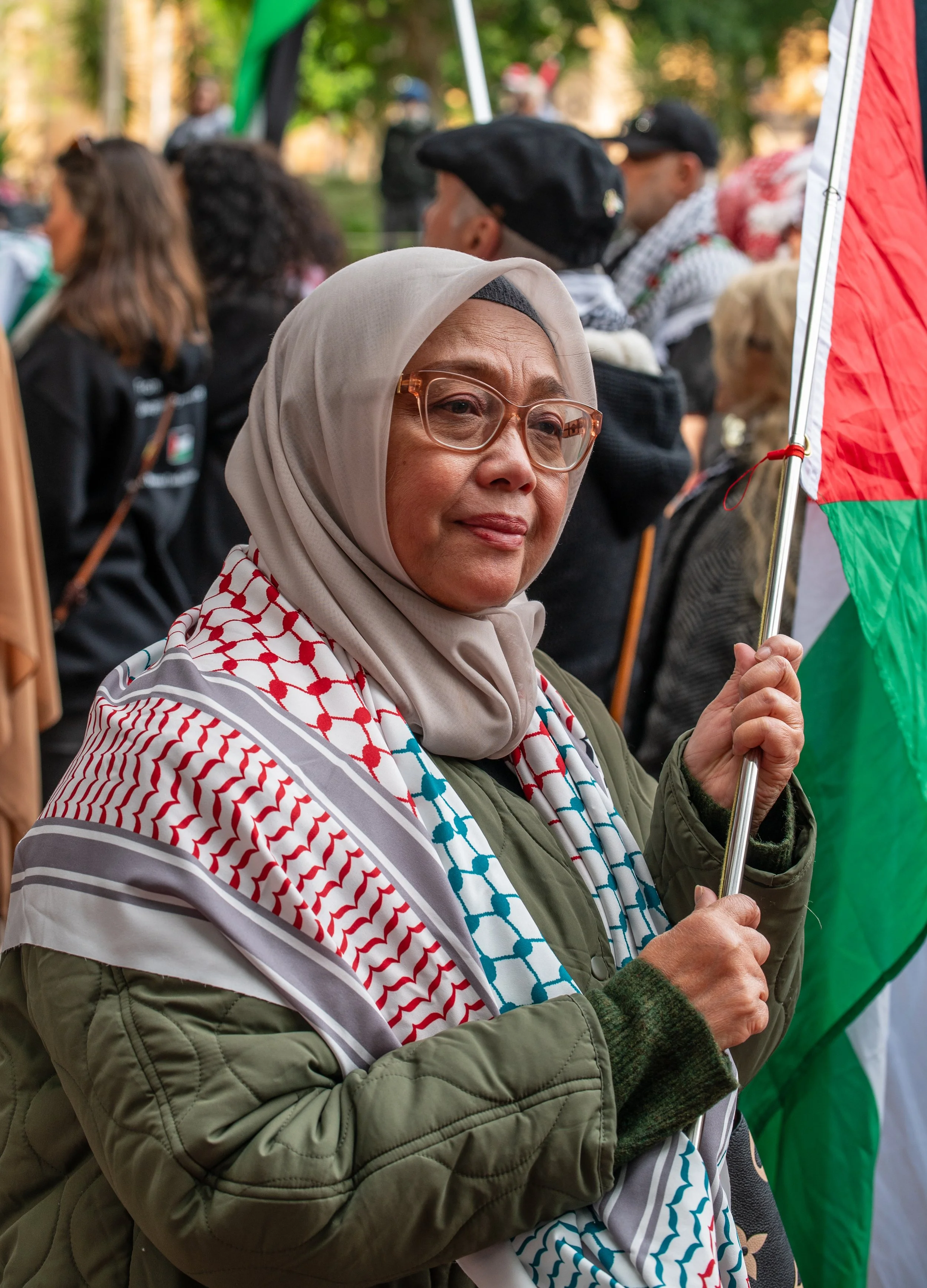 A woman wearing sunglasses, a gray cap, a pink jacket, and a black-and-white checkered scarf stands outdoors at a public event, holding a Palestinian flag.
