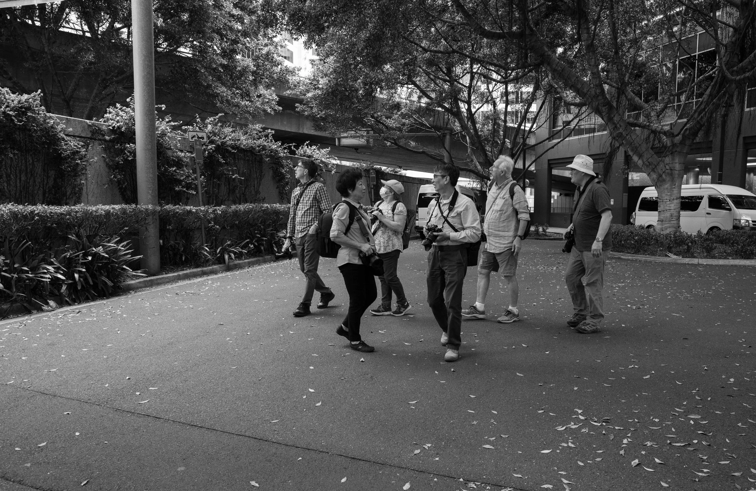 Group of six tourists with cameras walking and chatting in an urban park with trees, bushes, and a van parked nearby.