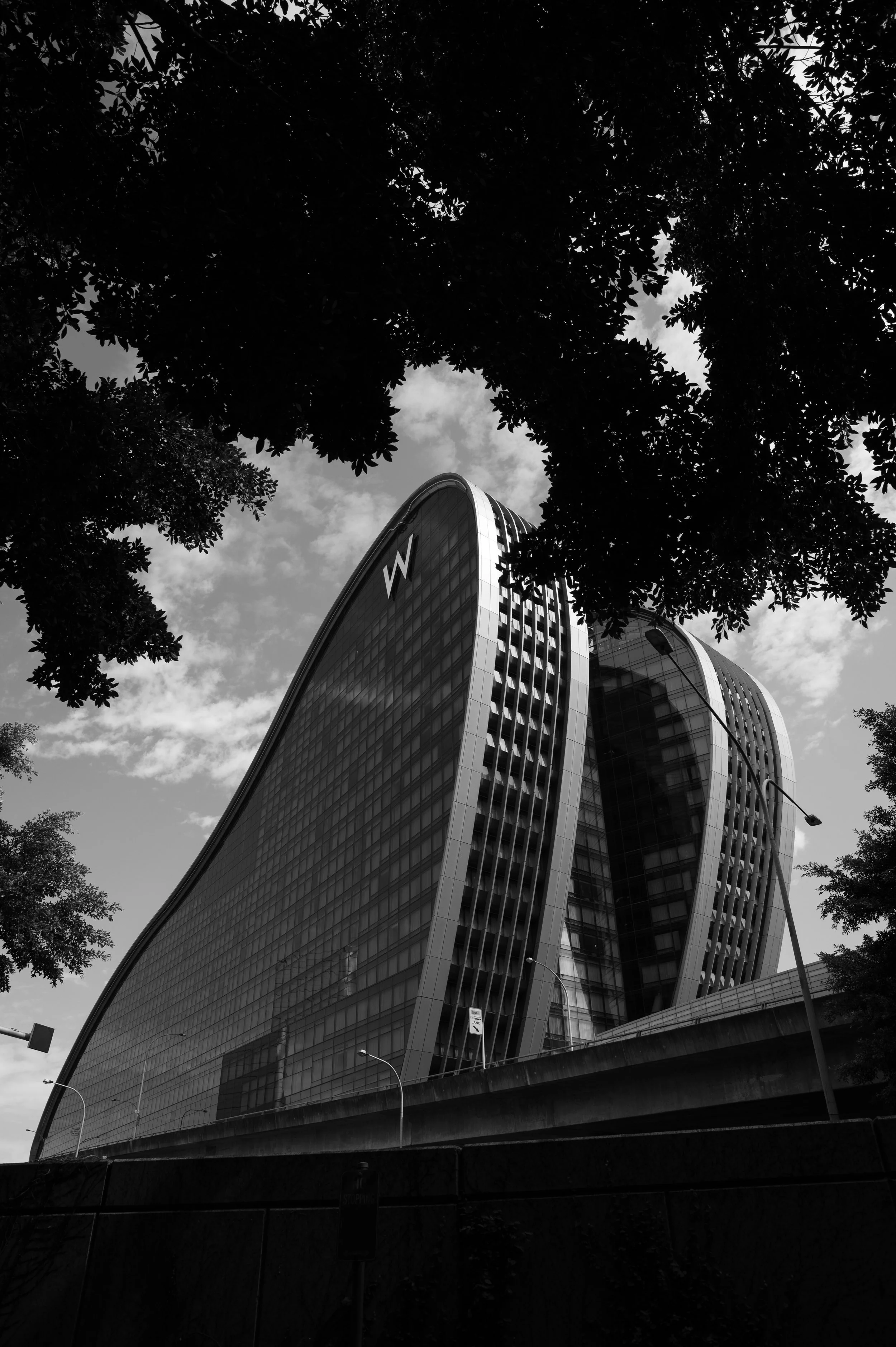 Black and white photo of the W Hotel building, a modern curved skyscraper with glass windows, surrounded by trees and a streetlamp.