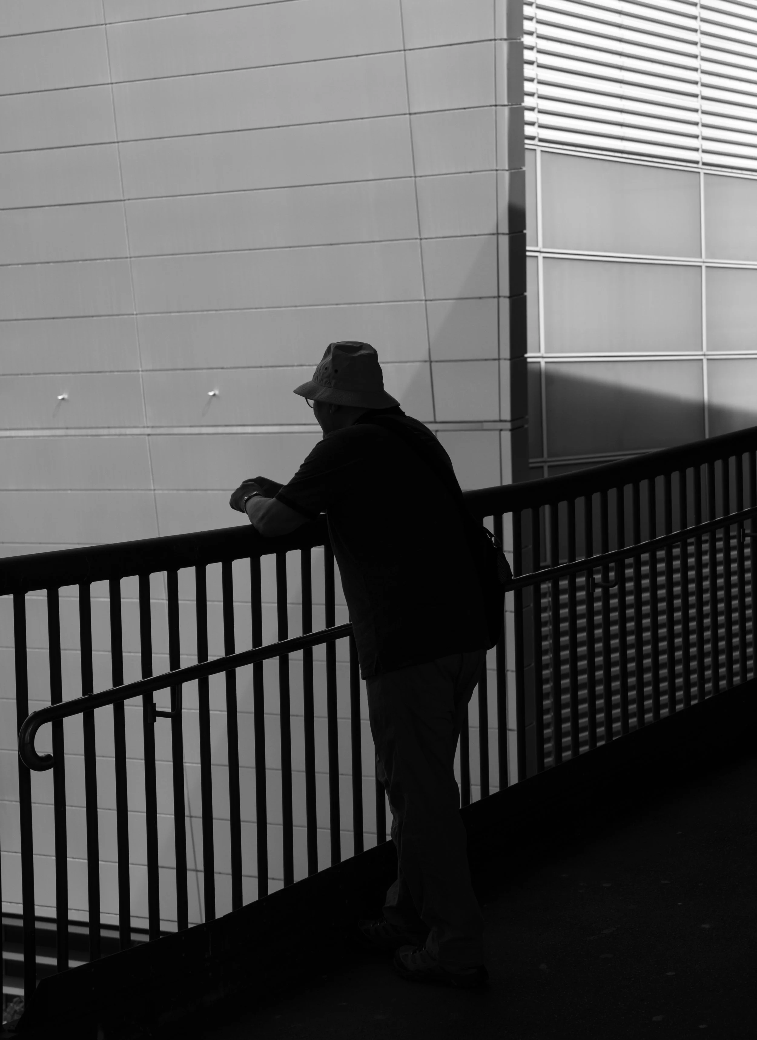 A silhouette of a man leaning on a railing, wearing a hat, against a modern building with varying textures and shadows.