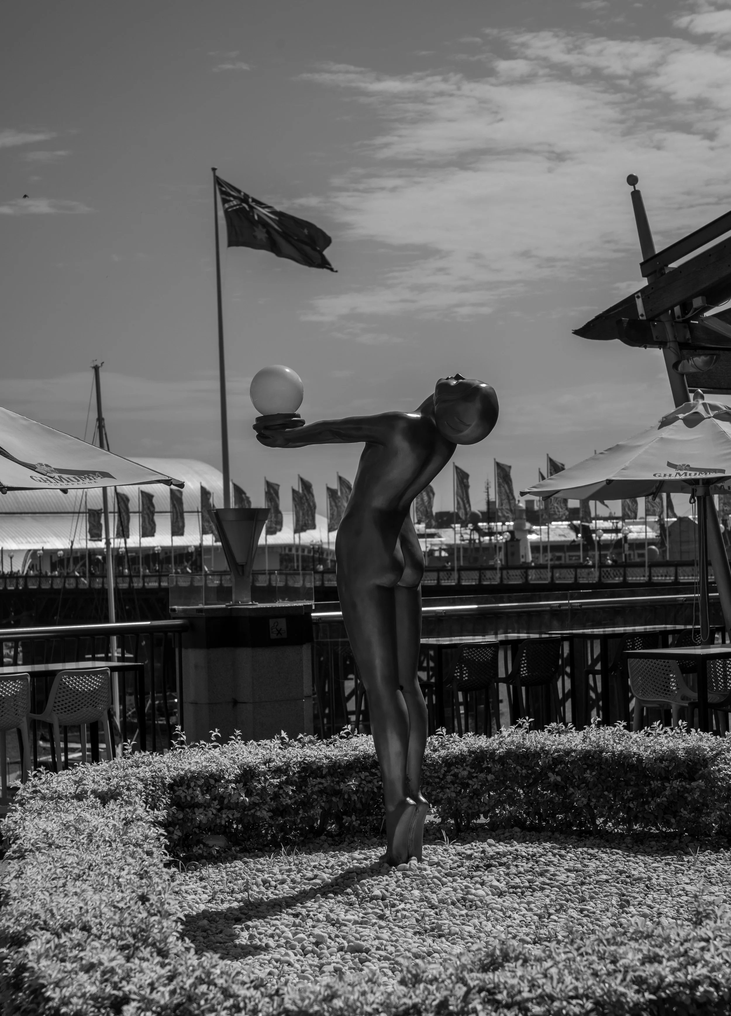 A sculpture of a stylized human figure holding a sphere with a flag of Australia in the background, set outdoors with umbrellas and flags along a waterfront.