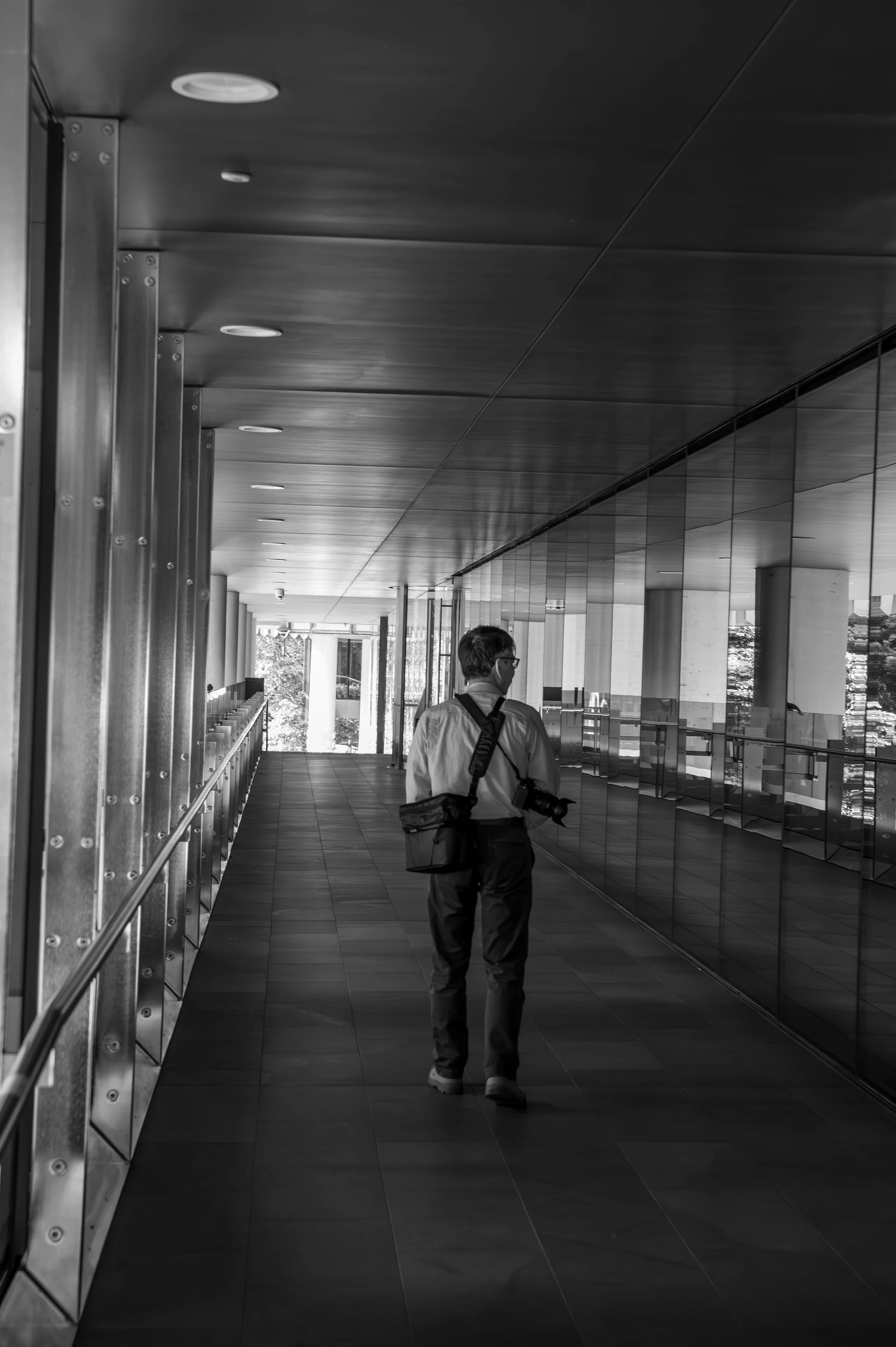 A man walking down an empty corridor with reflective glass walls and modern architectural design, carrying a camera and wearing a backpack.
