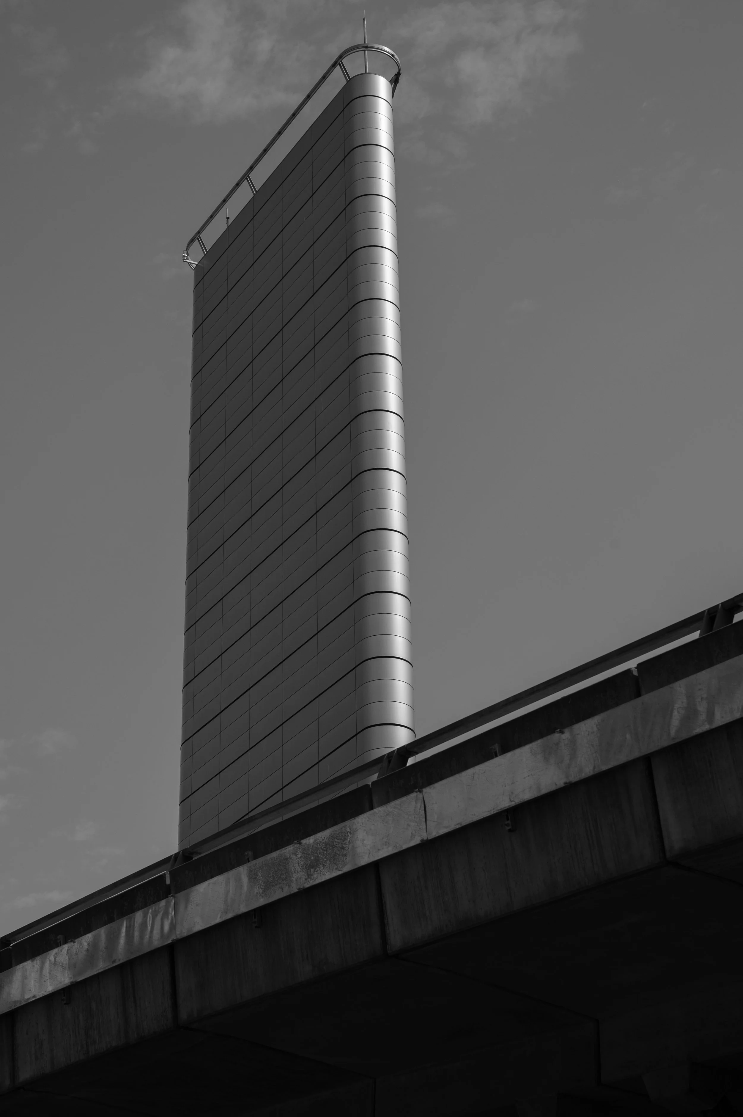 A black and white photo of an urban scene with modern buildings, including a tall cylindrical skyscraper, and a man walking with a camera on a pedestrian bridge with glass and metal architecture.
