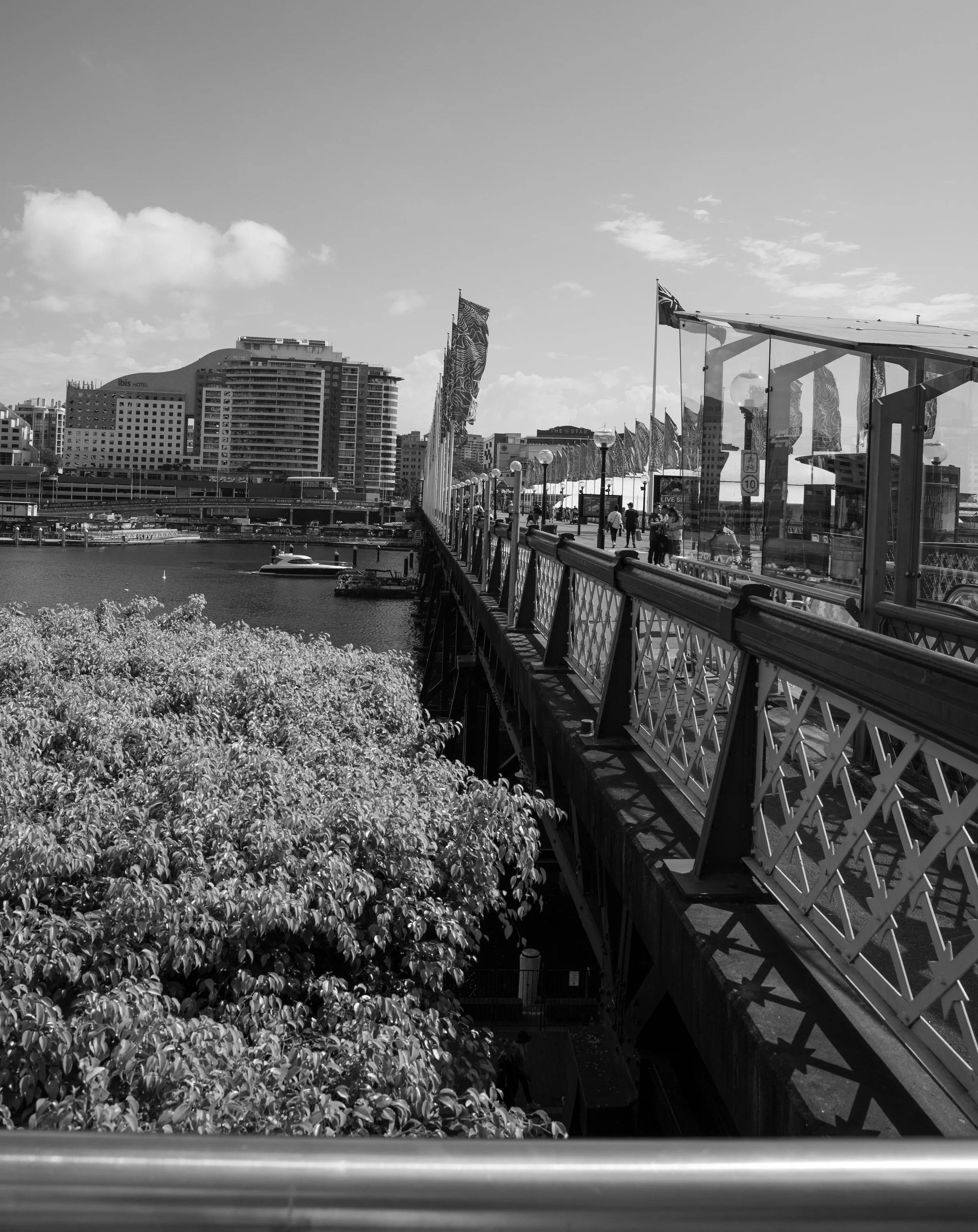 A black and white photo of Darling Harbour in Sydney, featuring a waterfront promenade, modern high-rise buildings, and people walking or sitting by the water.