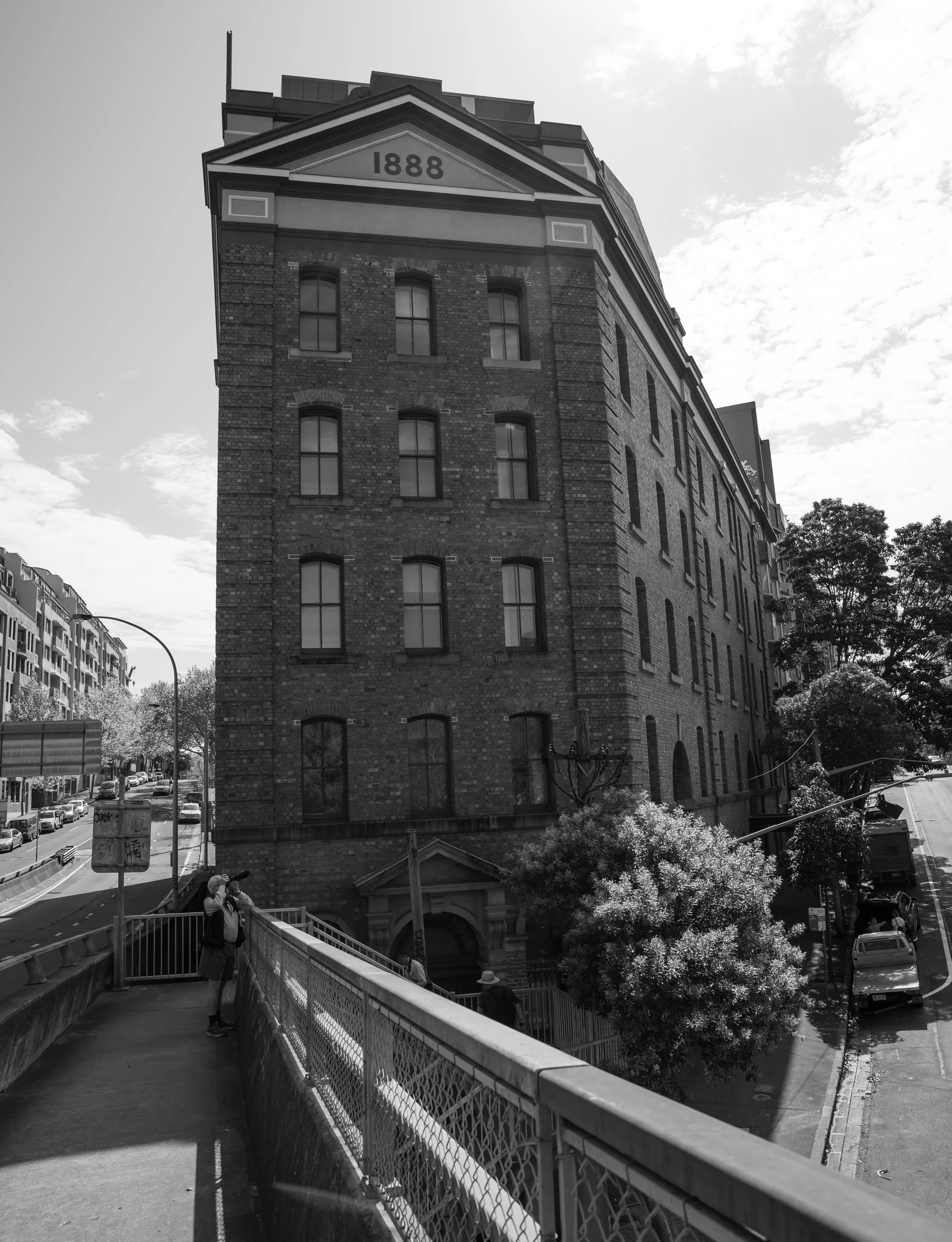 Black and white photo of an old brick building with the year 1888 inscribed on the facade, multiple windows, and a tree in front. A person is taking a photo near a railing, with a city street in the background.