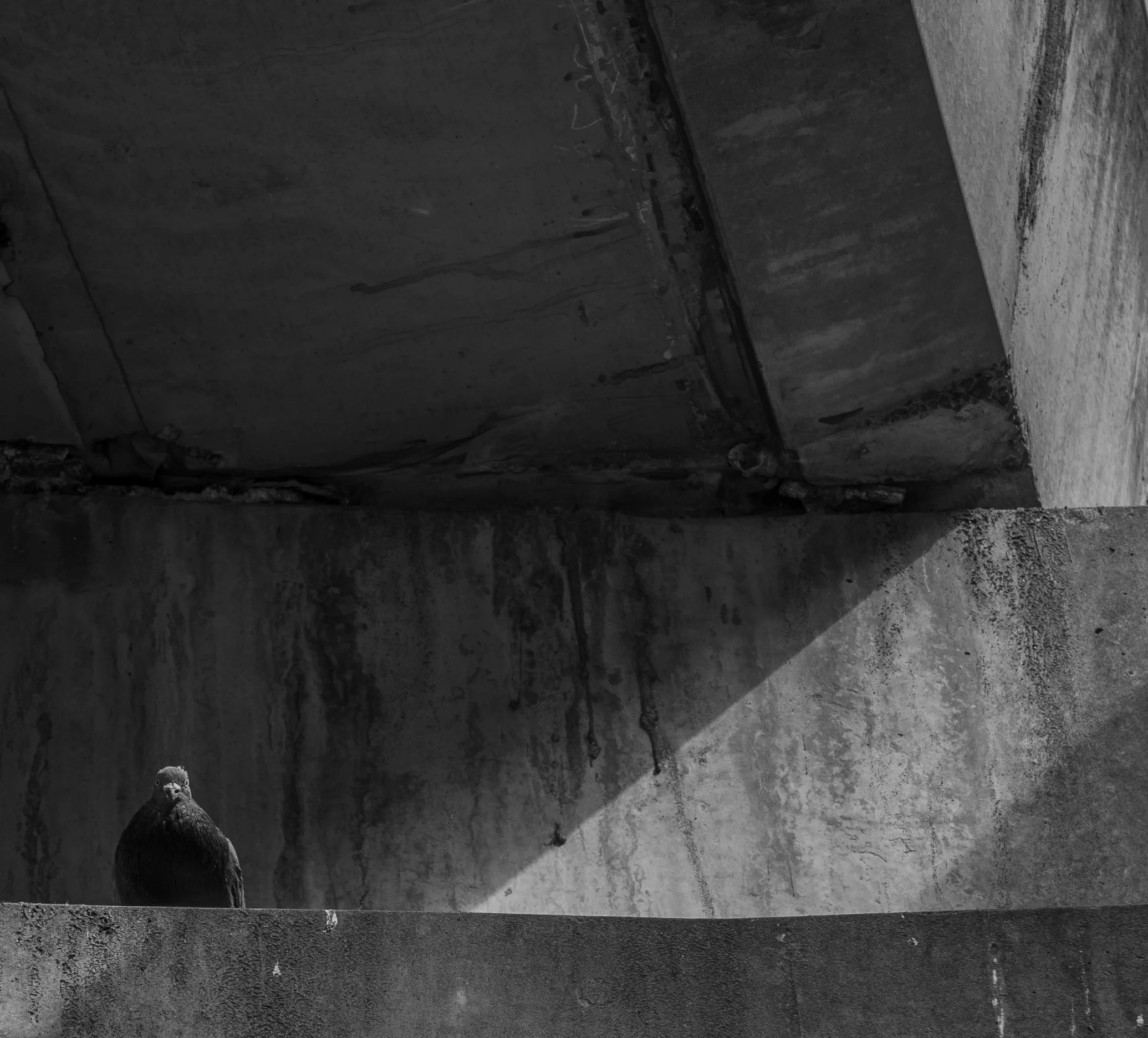 Black and white photograph of a bird perched on a diagonal concrete ledge with an industrial background.