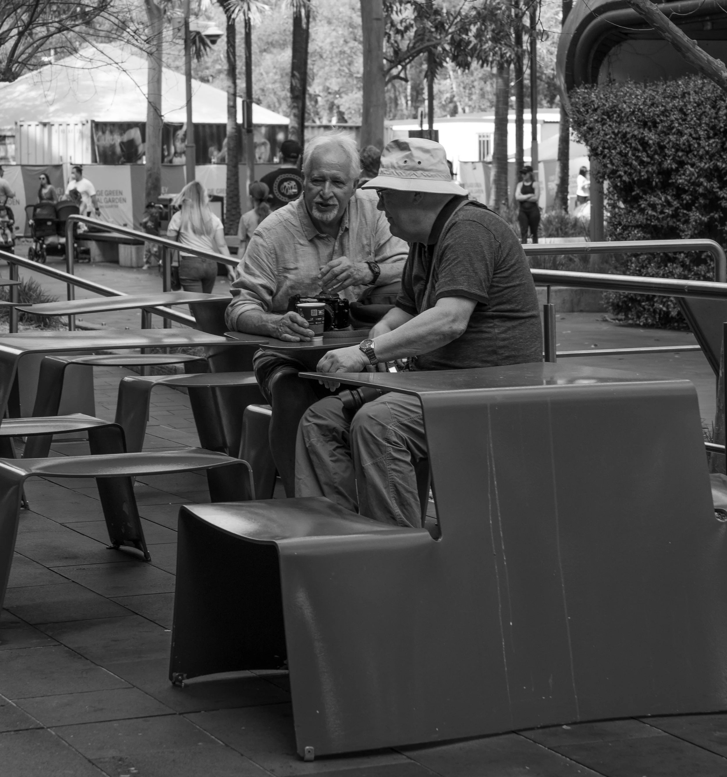 Two men sitting at a table outdoors, looking at a camera, with people walking in the background.