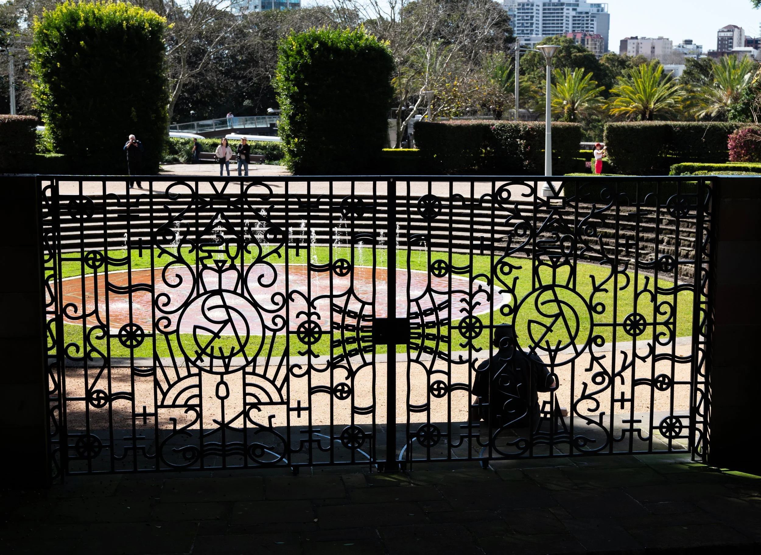 Decorative iron gate leading to a park with steps, lush green bushes, palm trees, and a city skyline in the background.
