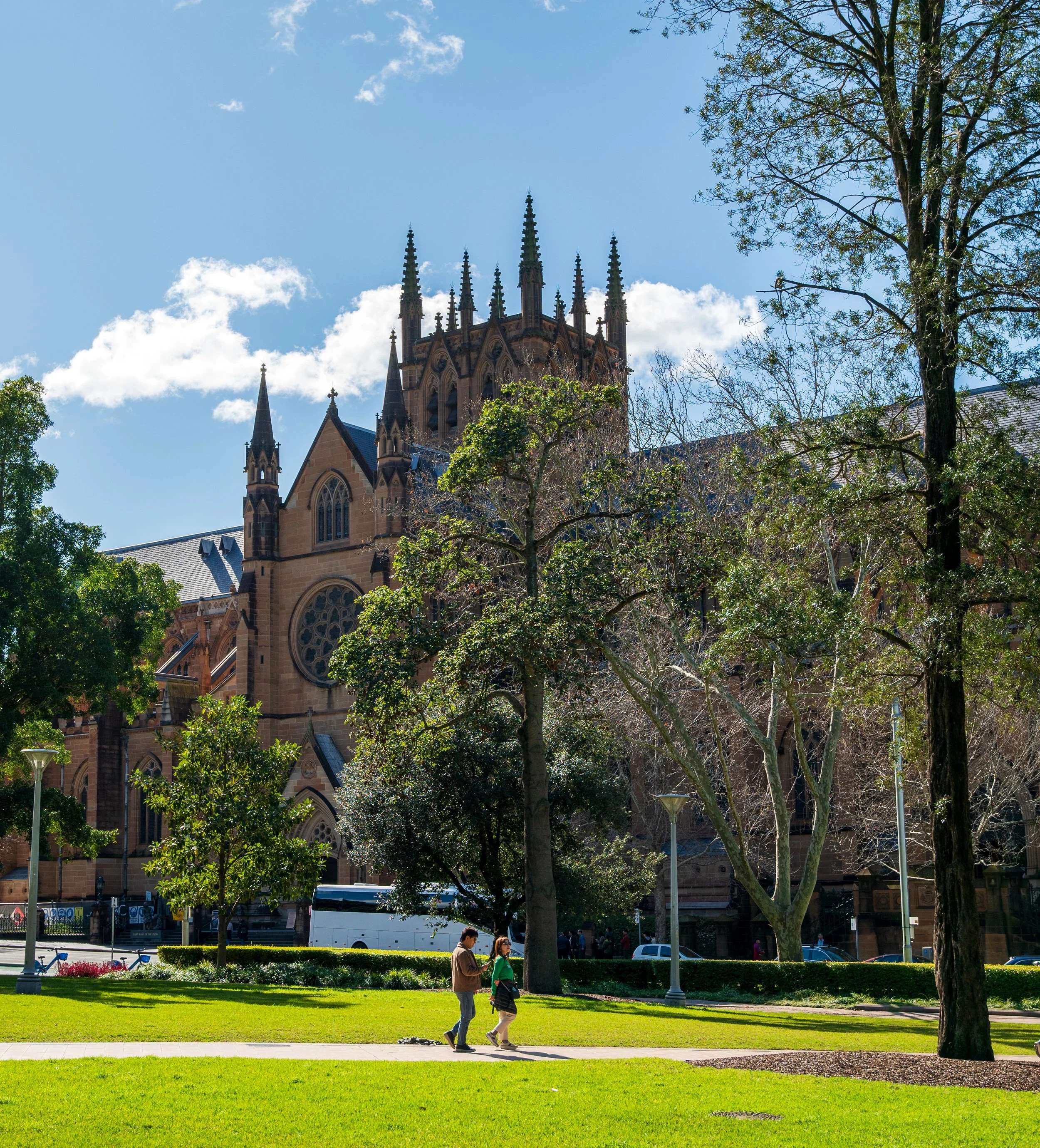 People walking on a grassy park with trees, in front of a large stone Gothic cathedral with spires, pointed arches, and rose windows, under a bright blue sky with clouds.