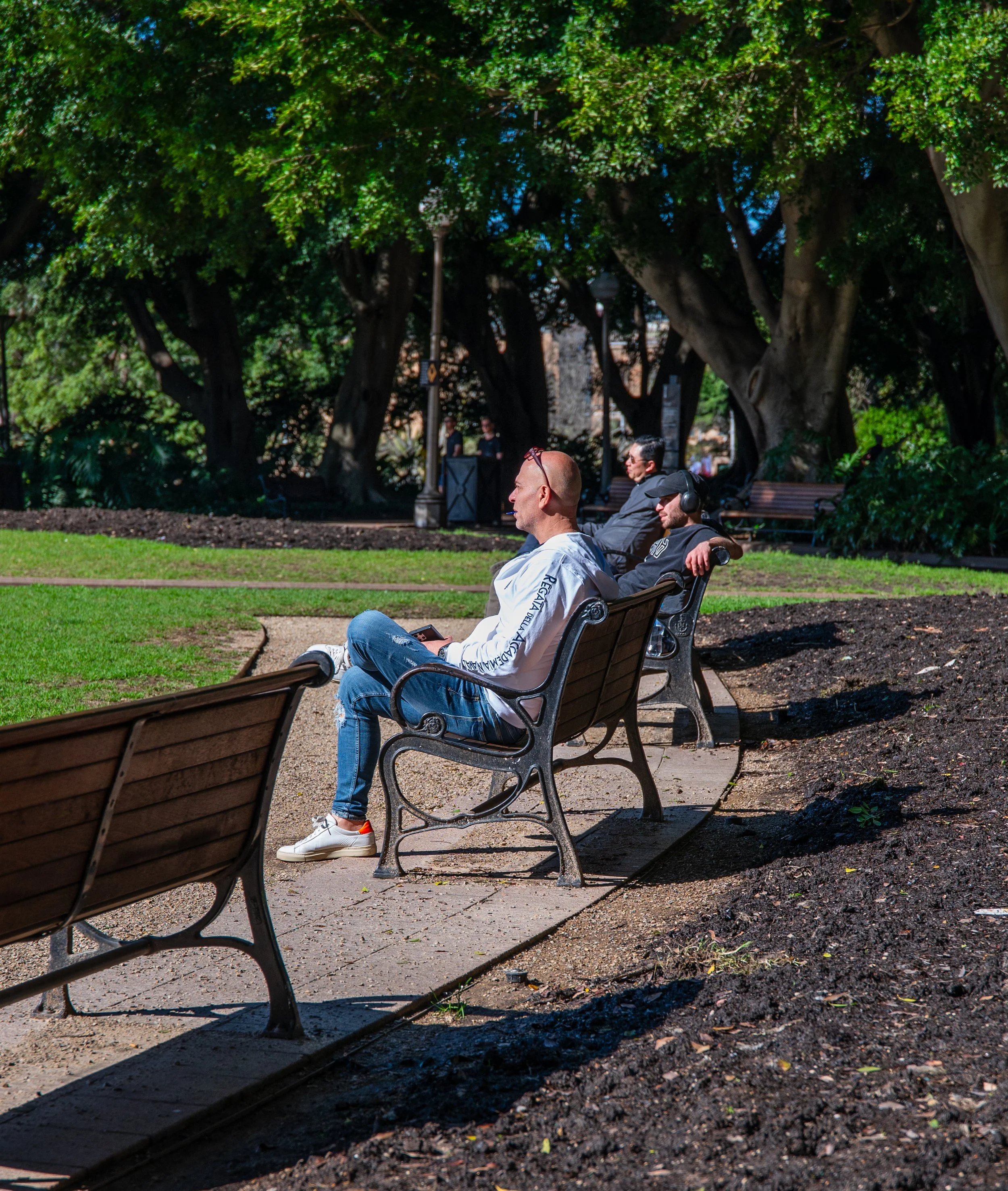 Three men sitting on park benches on a sunny day, surrounded by lush green trees and shaded areas.