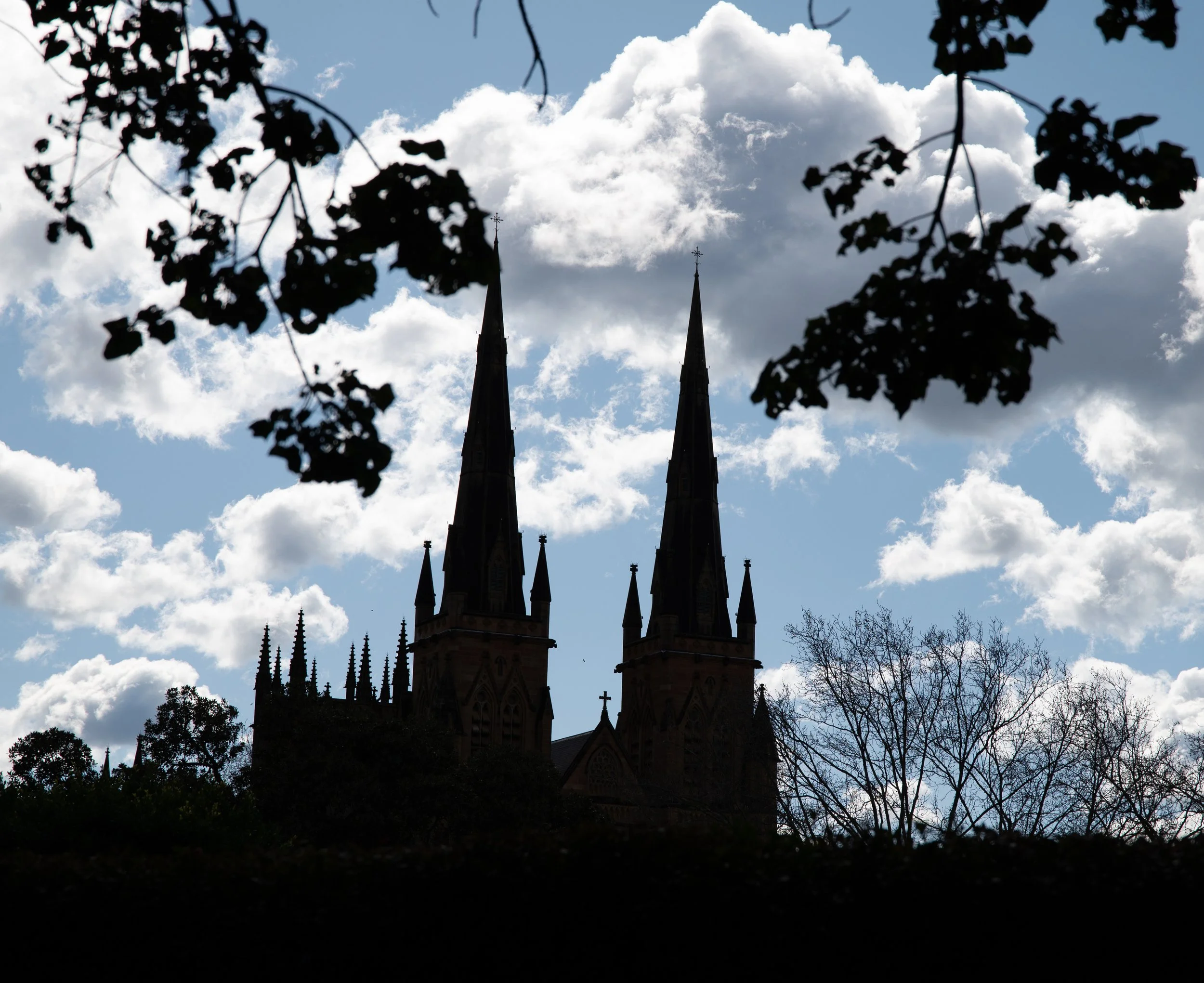 Silhouette of a Gothic-style church with tall spires, set against a partly cloudy sky, with tree branches framing the scene.