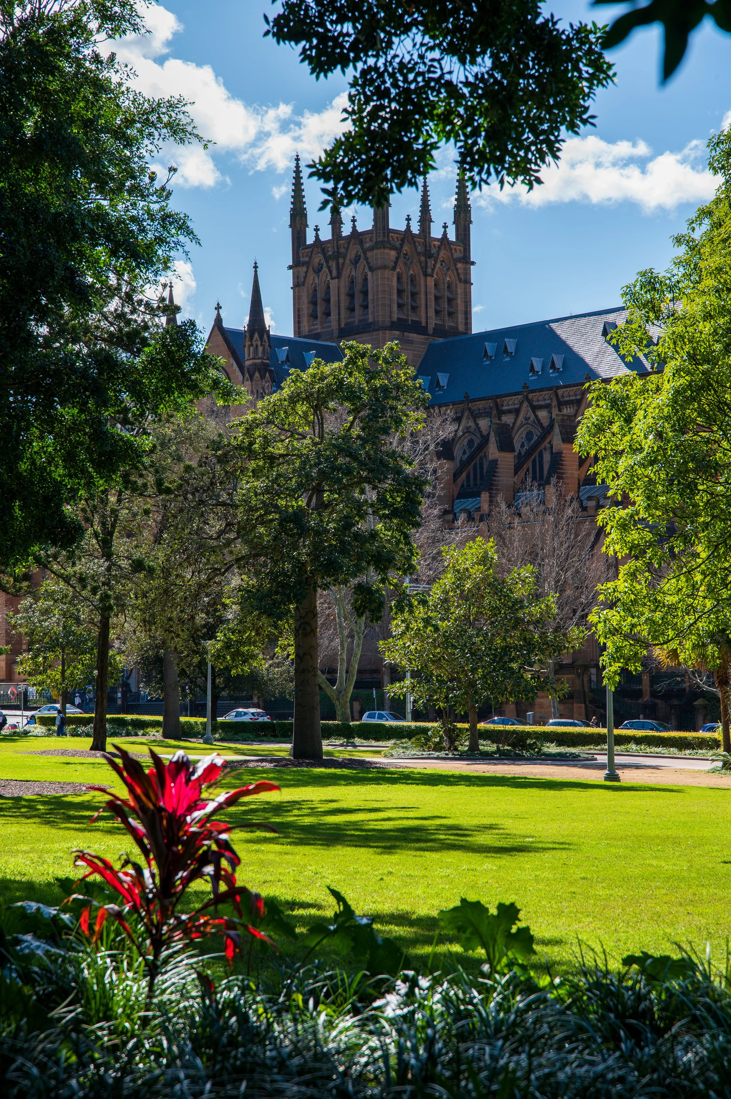 A park with green grass, trees, and blooming plants in the foreground, and a large Gothic-style church or cathedral with spires in the background under a partly cloudy sky.