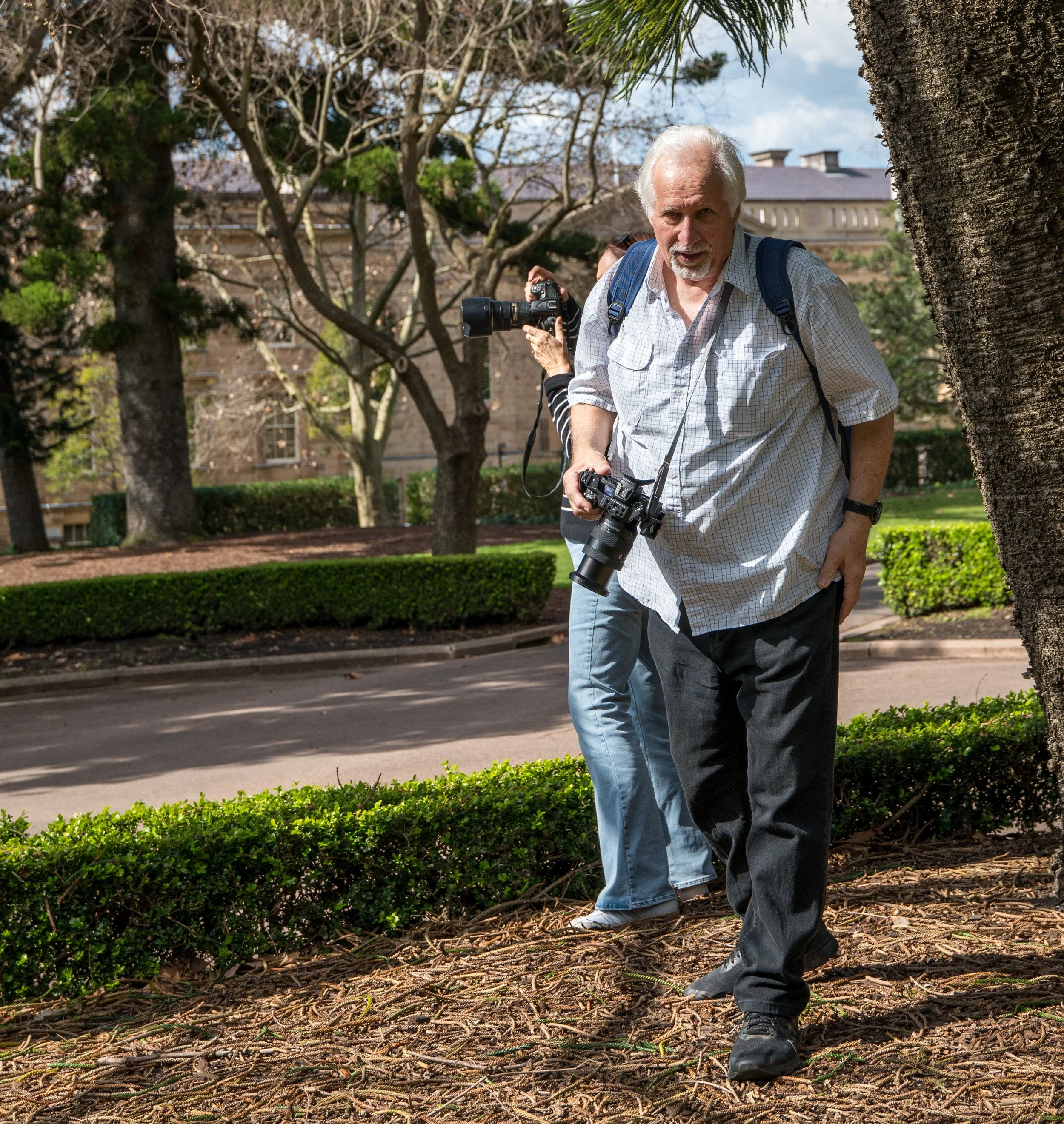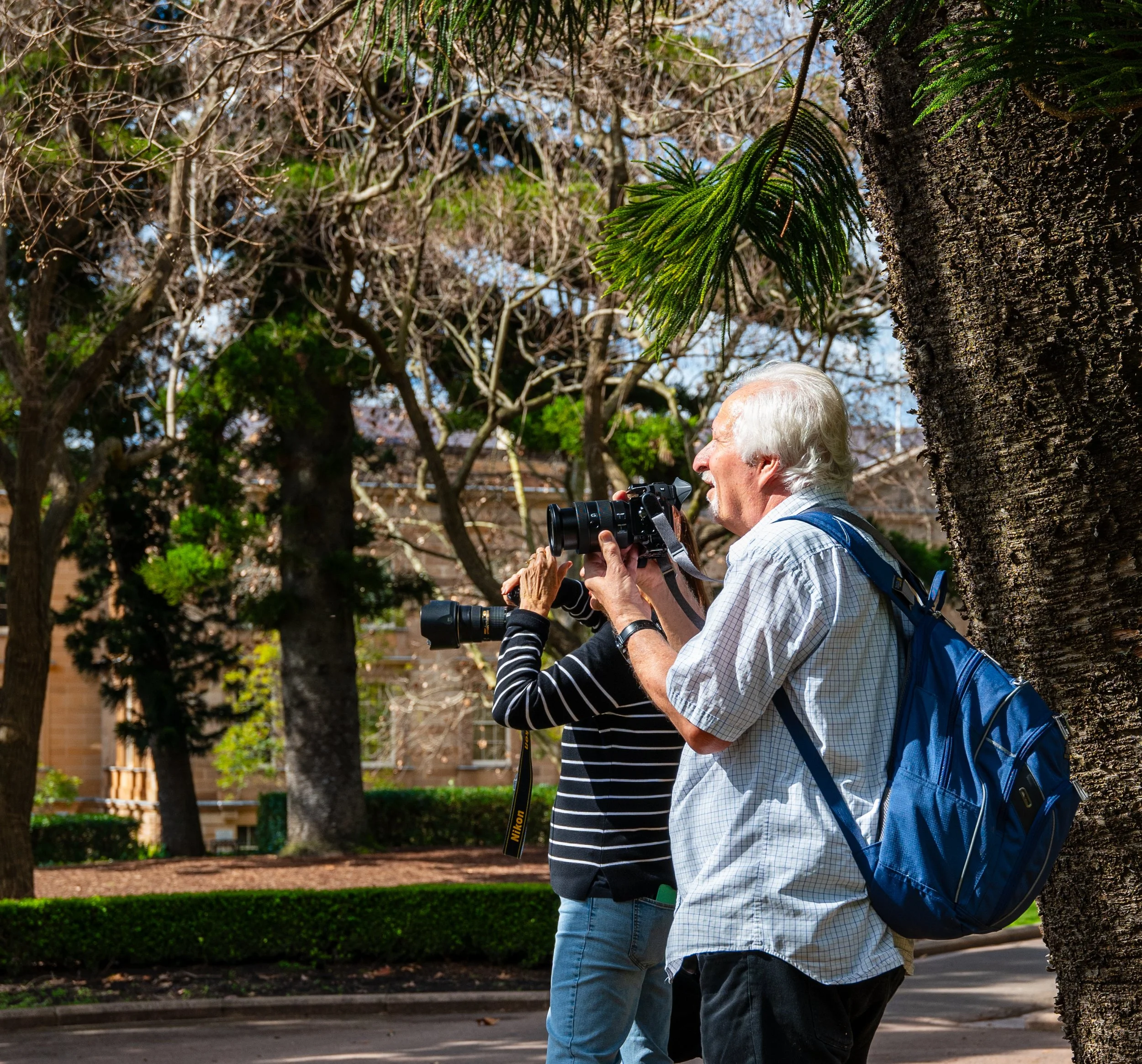An elderly man with white hair takes a photograph with a camera while standing near a tree in a park on a sunny day.