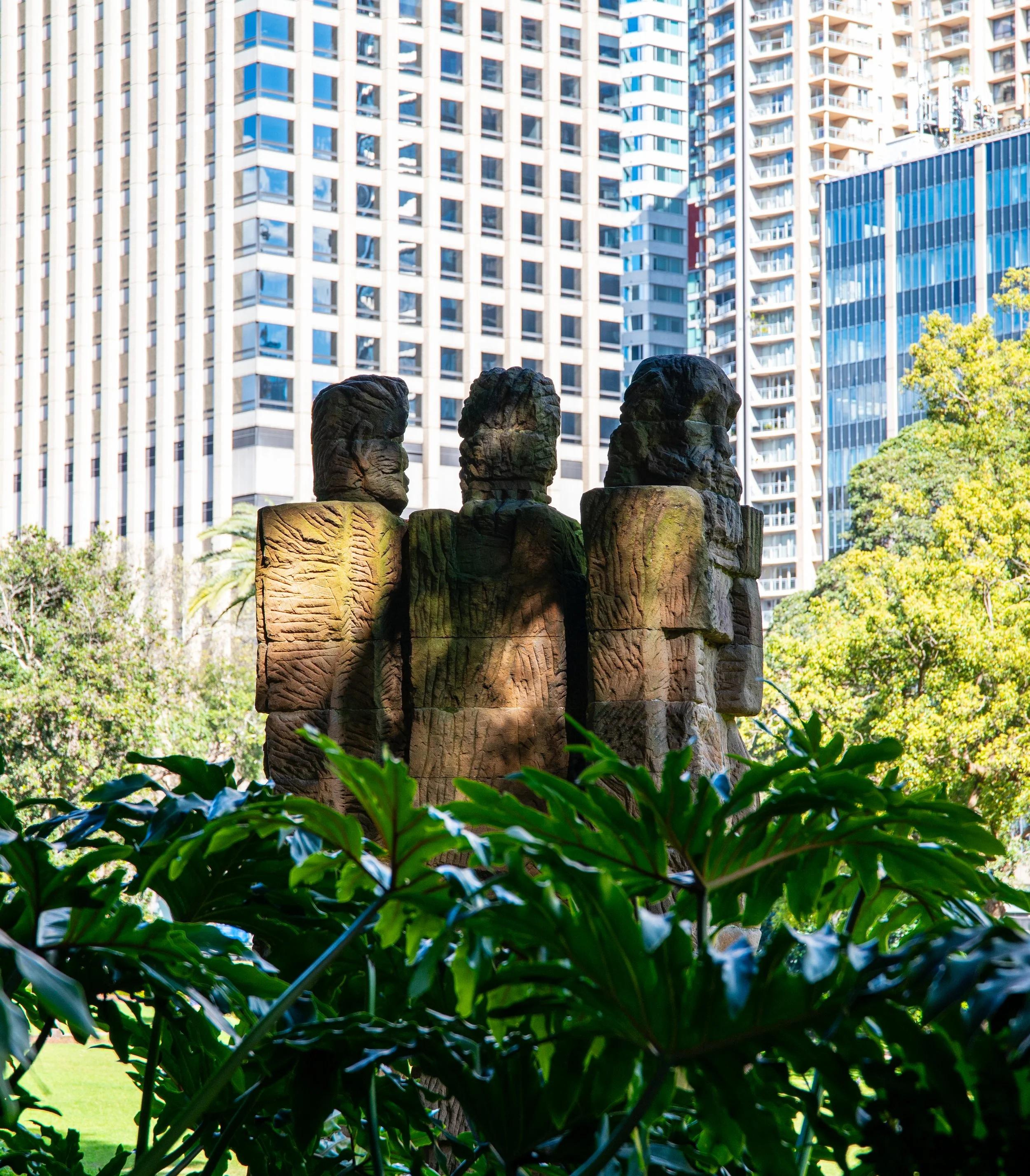 Stone sculpture of four people in front of tall modern office buildings, surrounded by green trees and plants in an urban park.