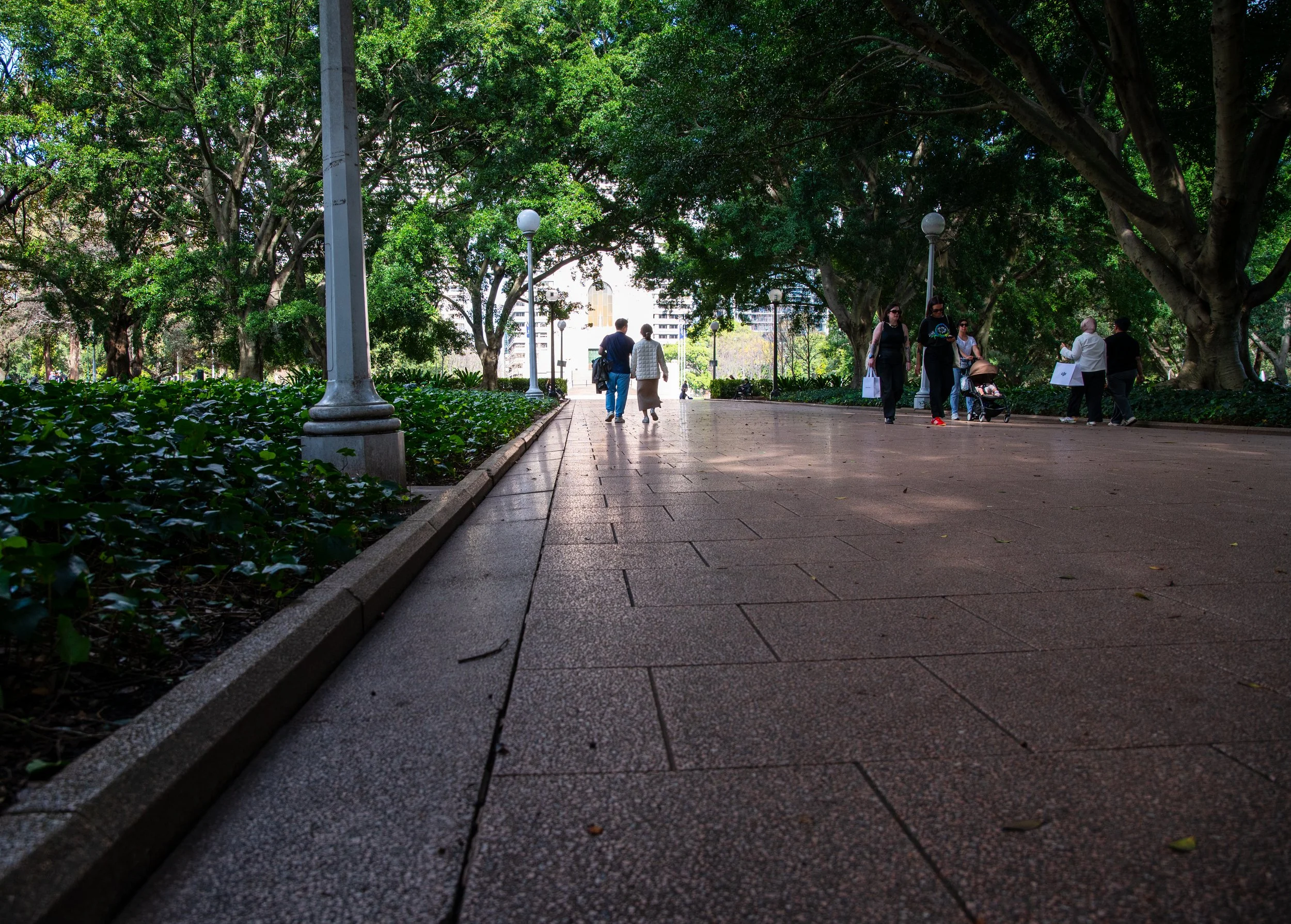 People walking through a shaded park with large trees and lampposts on a paved path.