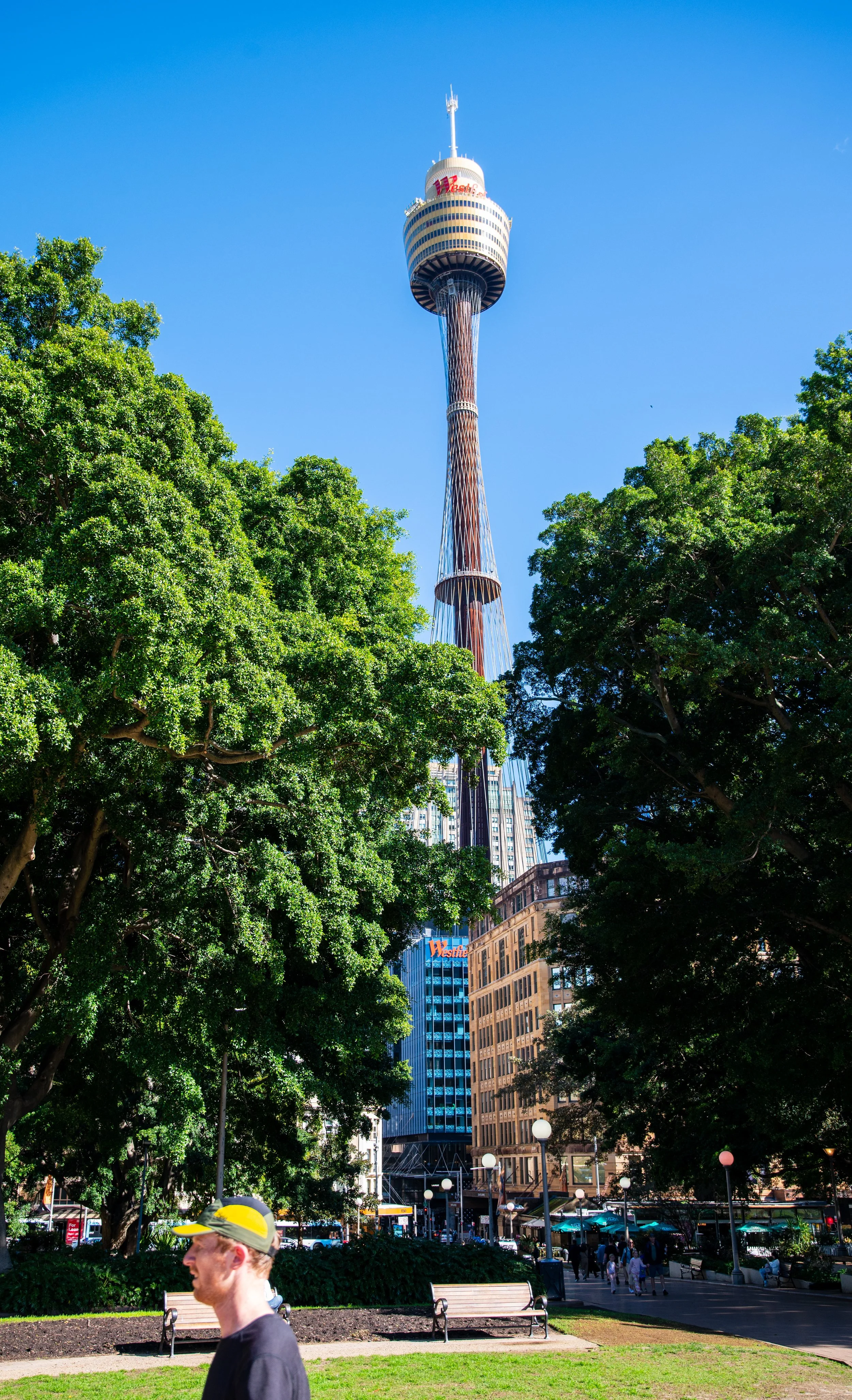 Sydney Tower Observatory visible above a city park with green trees, benches, and pedestrians on a sunny day.