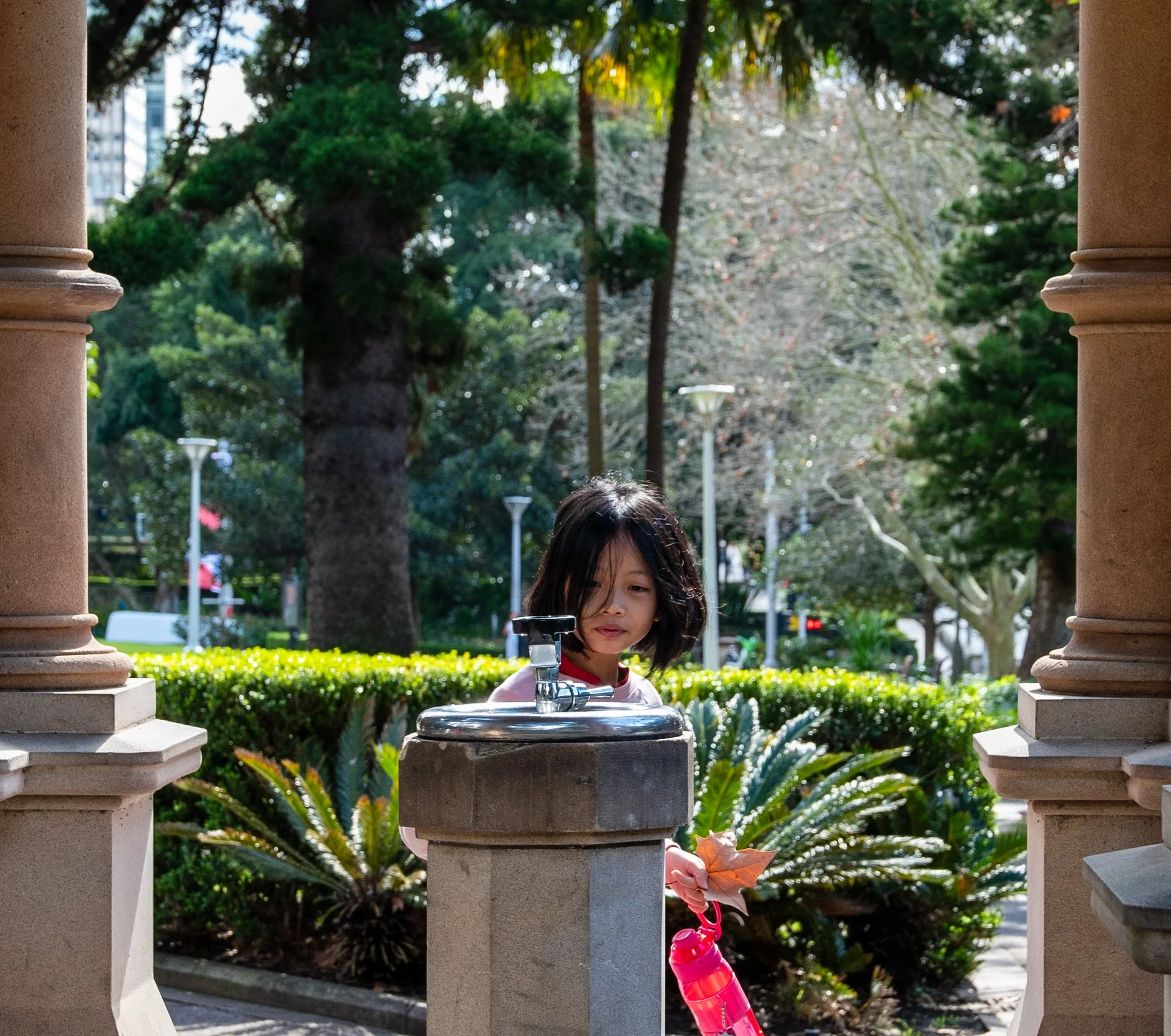 A young girl with shoulder-length black hair, holding a brown autumn leaf and a red water bottle, stands between two stone columns of a park pavilion, with trees, shrubs, and park lamps in the background.