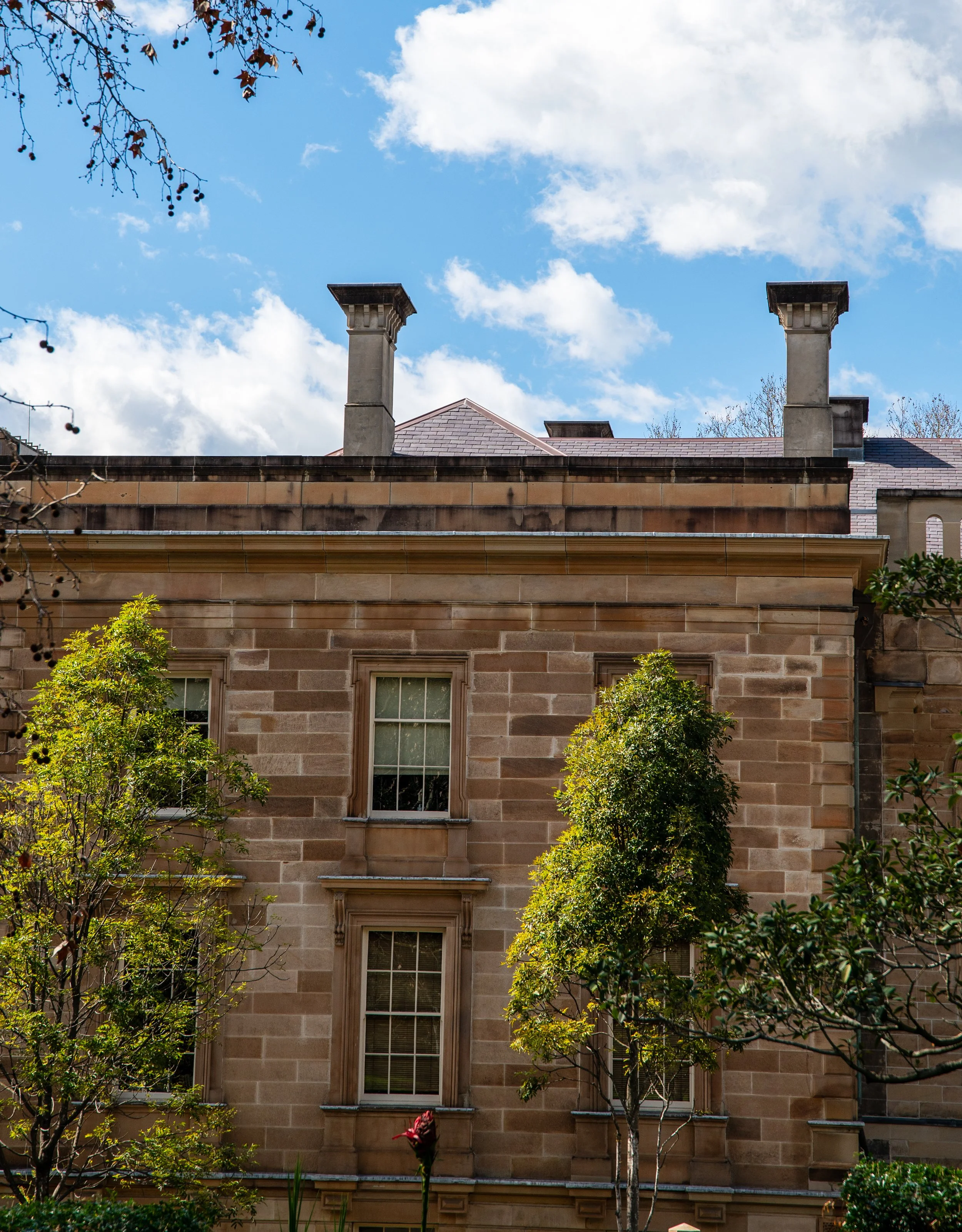 A brick building with two trees in front and two chimneys on the roof, under a partly cloudy blue sky.