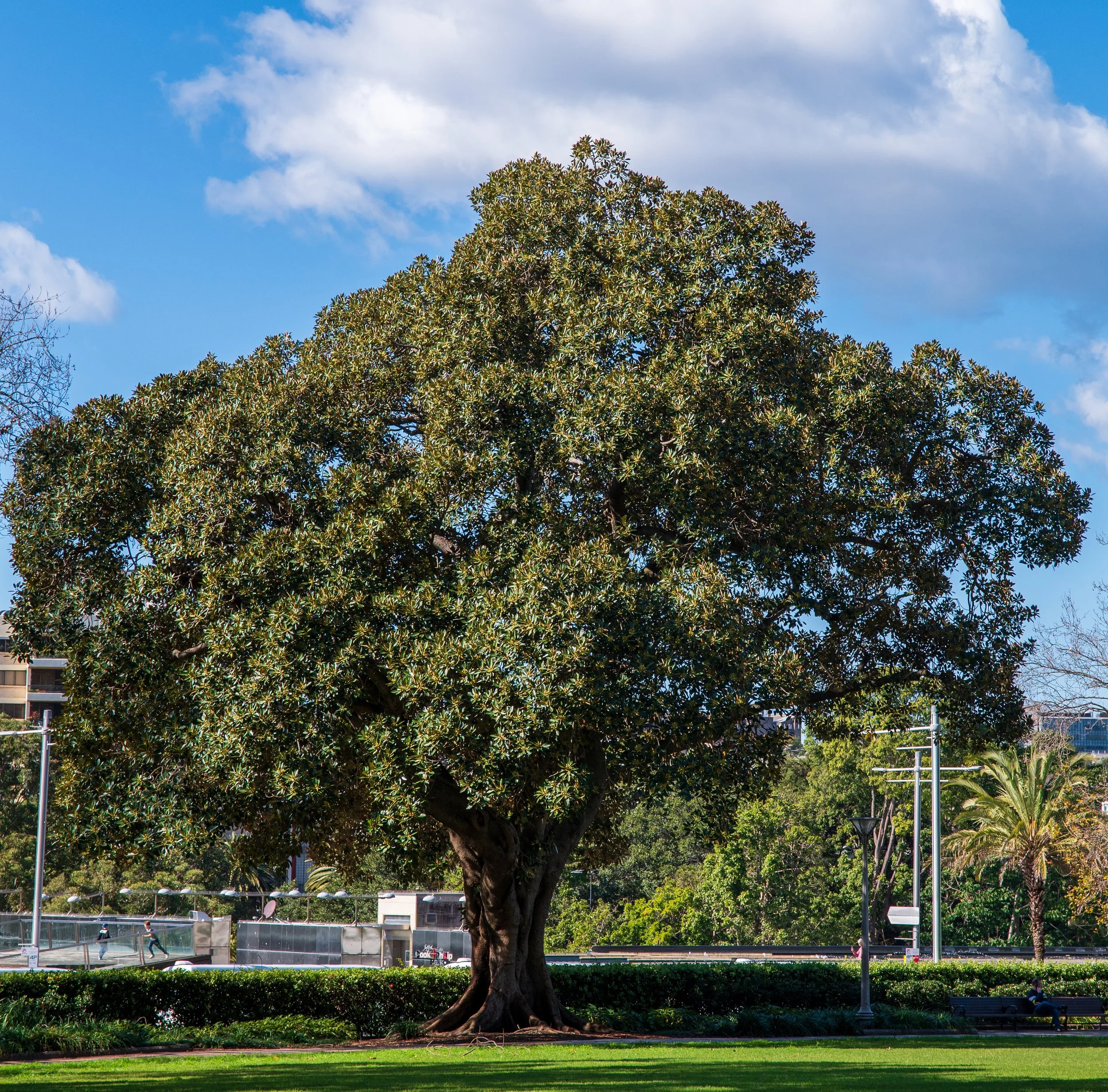 Large green tree in a park with a blue sky and clouds, surrounded by well-maintained grass and some palm trees in the background.