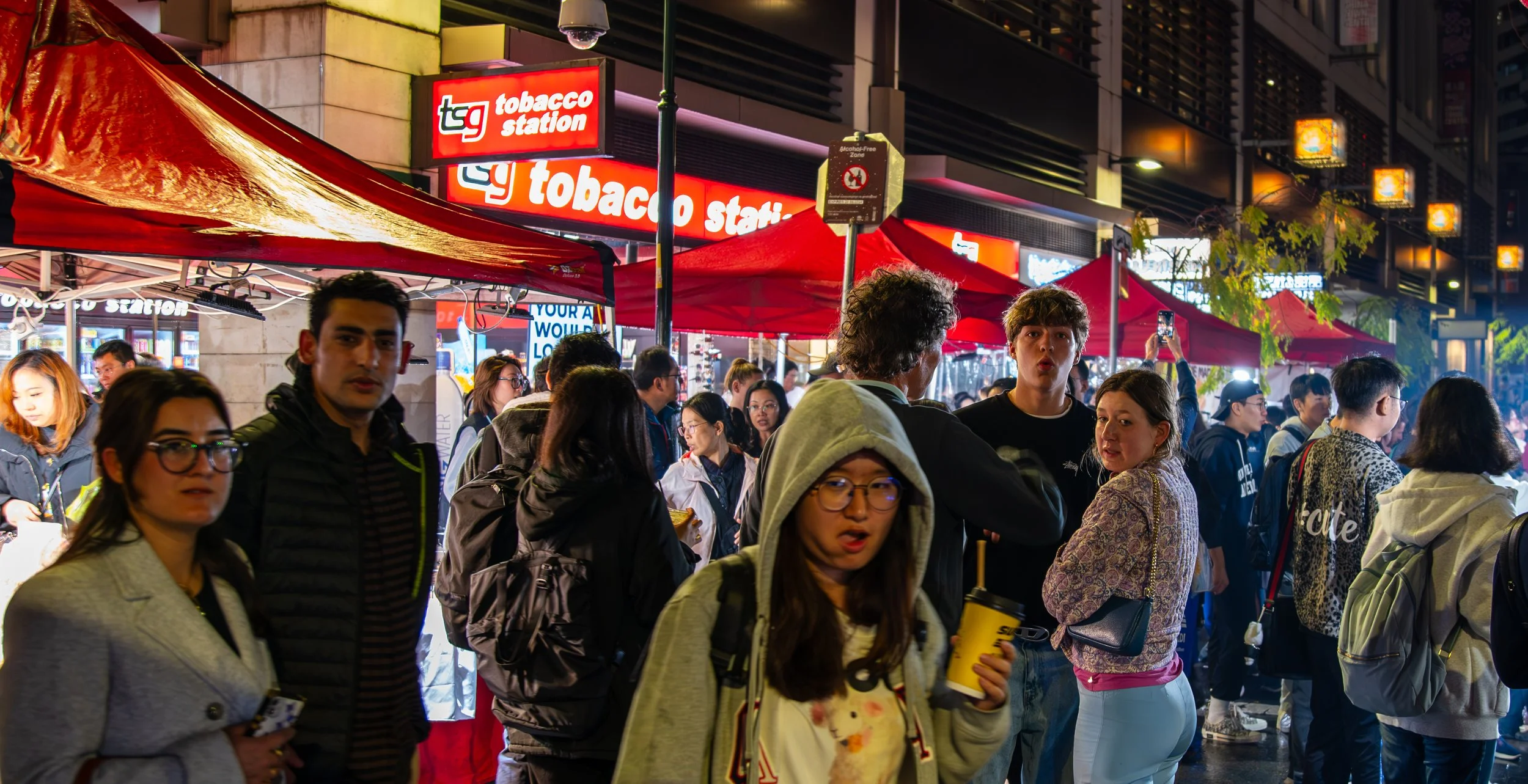 Crowded city street at night with people walking past a tobacco store and food vendors under red tents, illuminated signage, and lit street lamps.