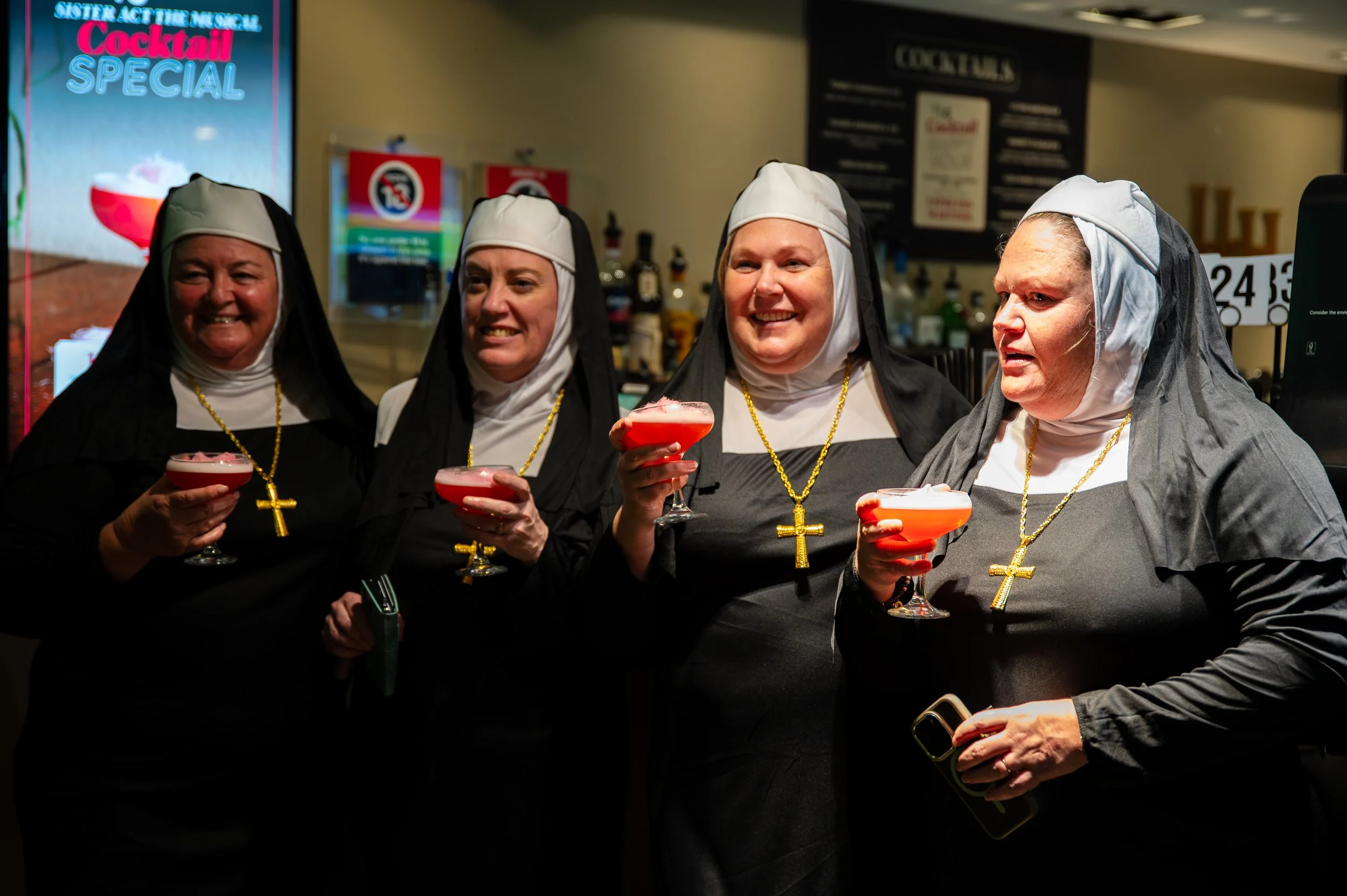 Four women dressed as nuns holding pink cocktails at a bar or restaurant, smiling and posing for a photo.