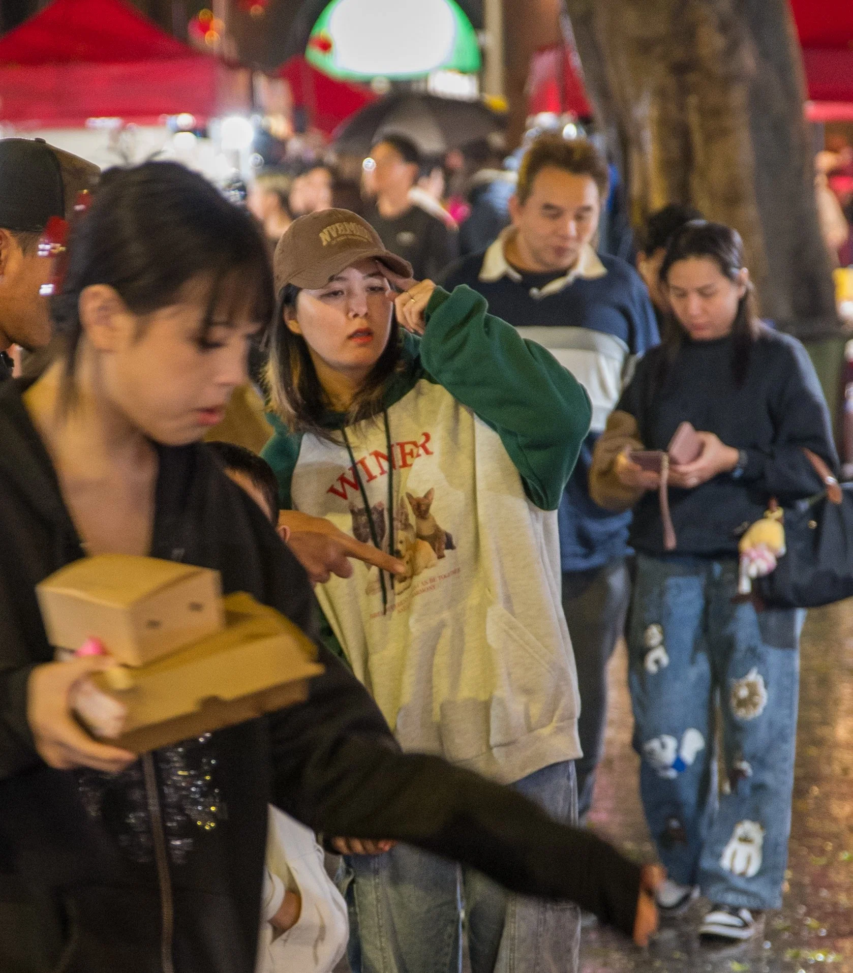 A group of people standing in line outdoors at night, with some looking at their phones, a woman in the foreground holding food boxes, and others waiting behind her.