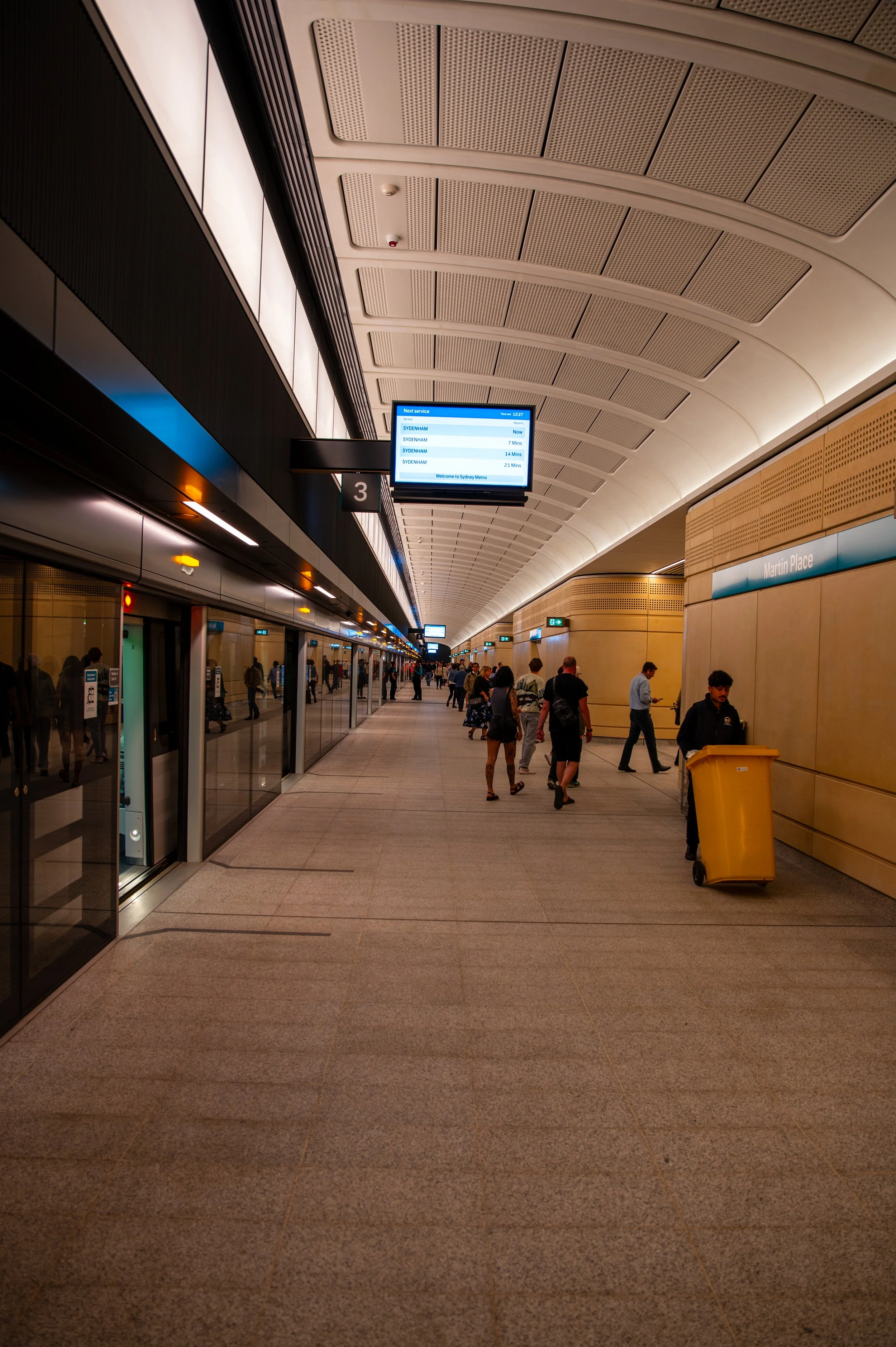 People walking on a tunnel-like train station platform with digital departure boards overhead and a sign indicating platform 3. A person with a yellow trash bin is visible on the right.