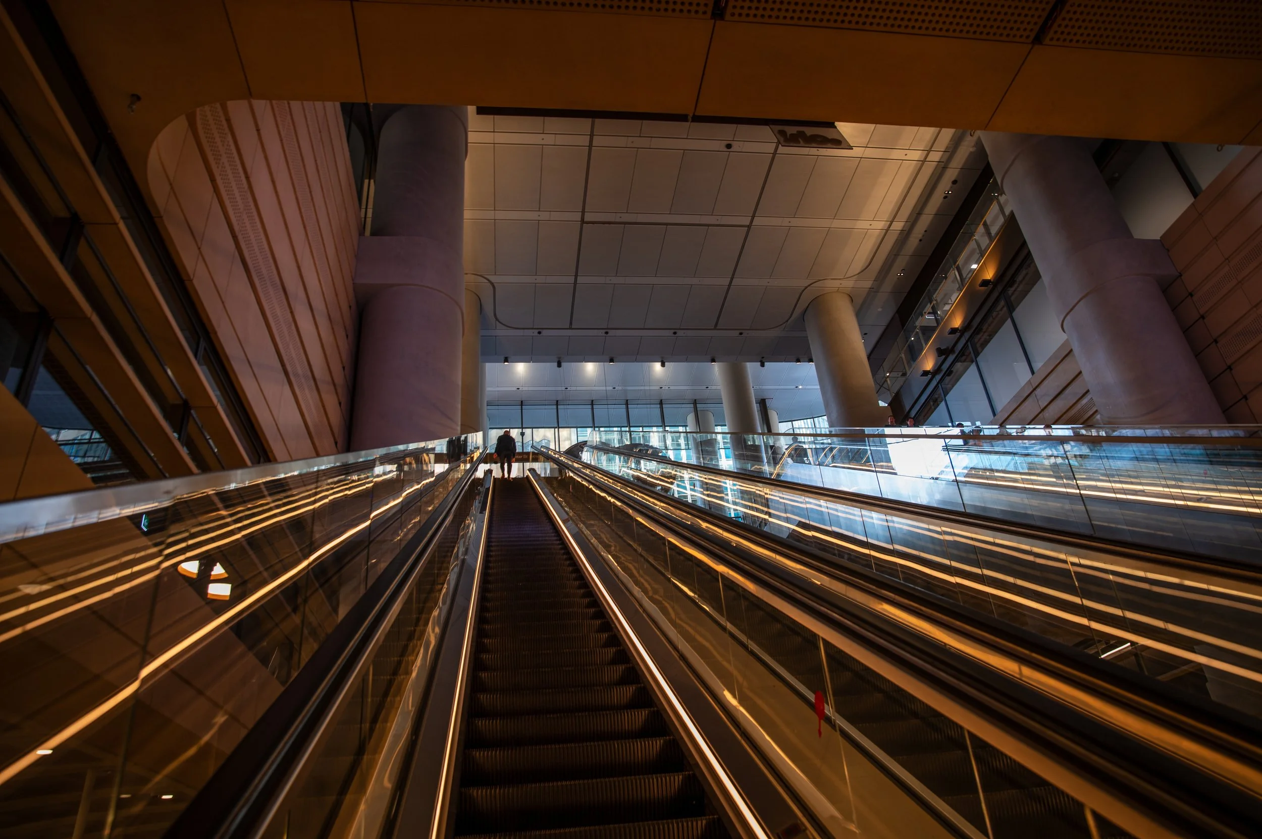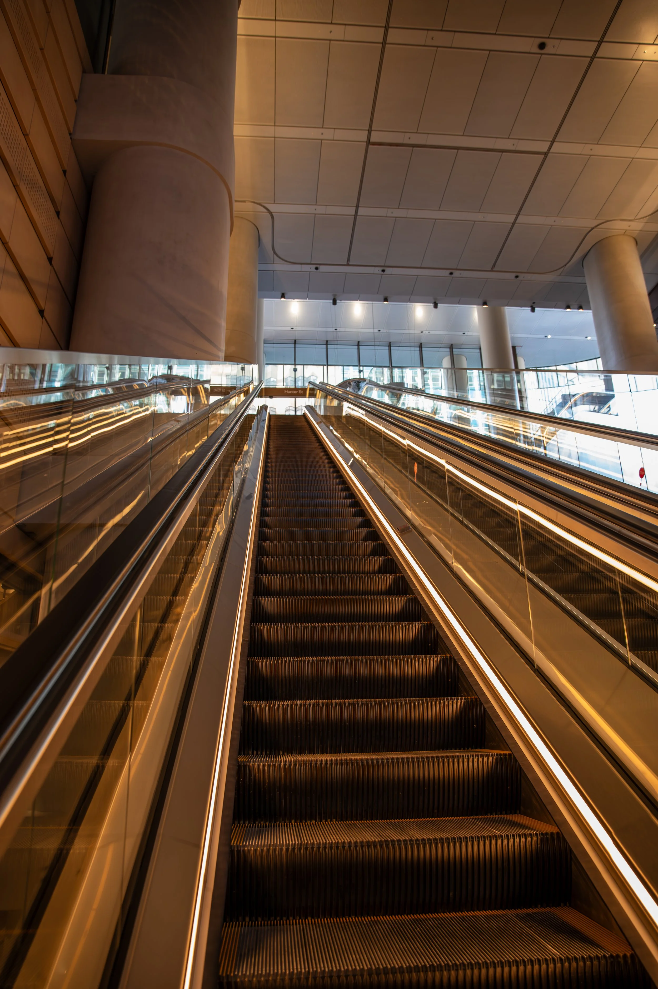 An upward view of an escalator inside a modern building, with glass sides and a high ceiling.