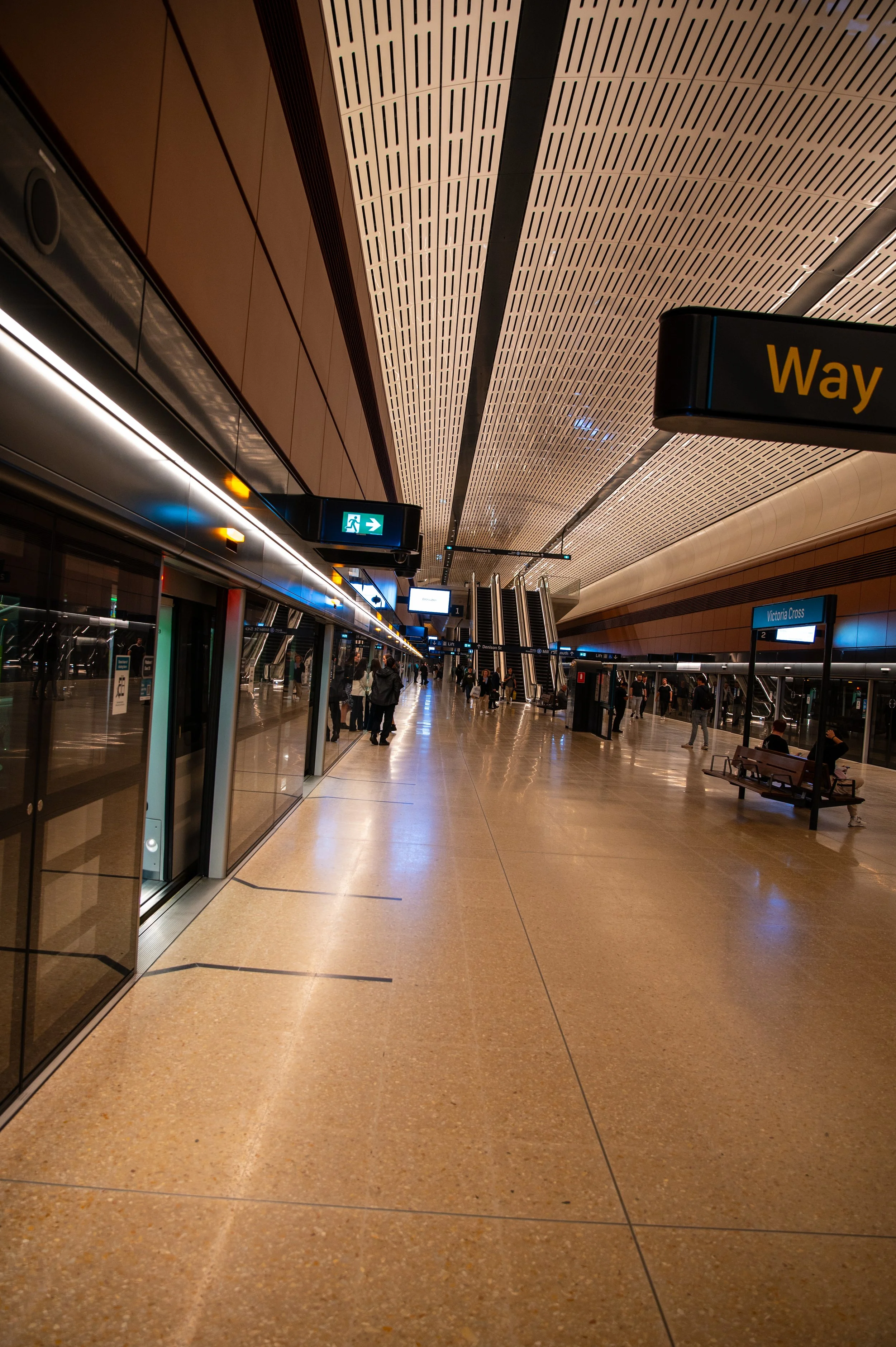 Interior of a modern subway or train station with people waiting and walking, escalators leading up, digital signboards displaying schedules, and glass doors.