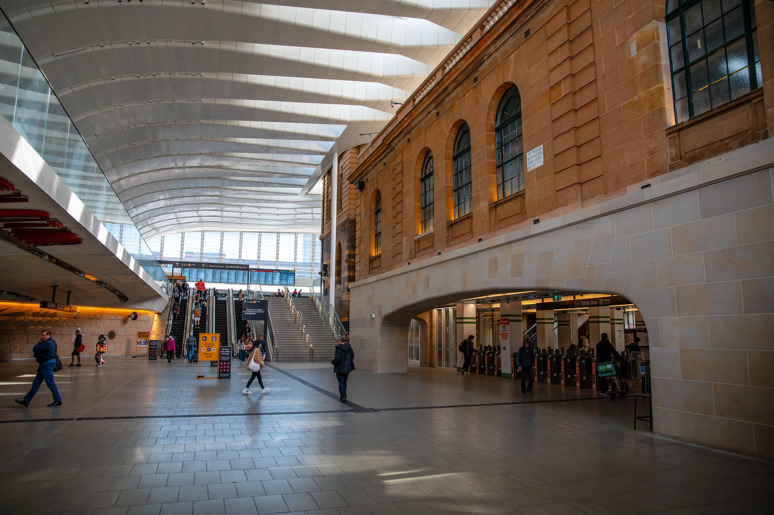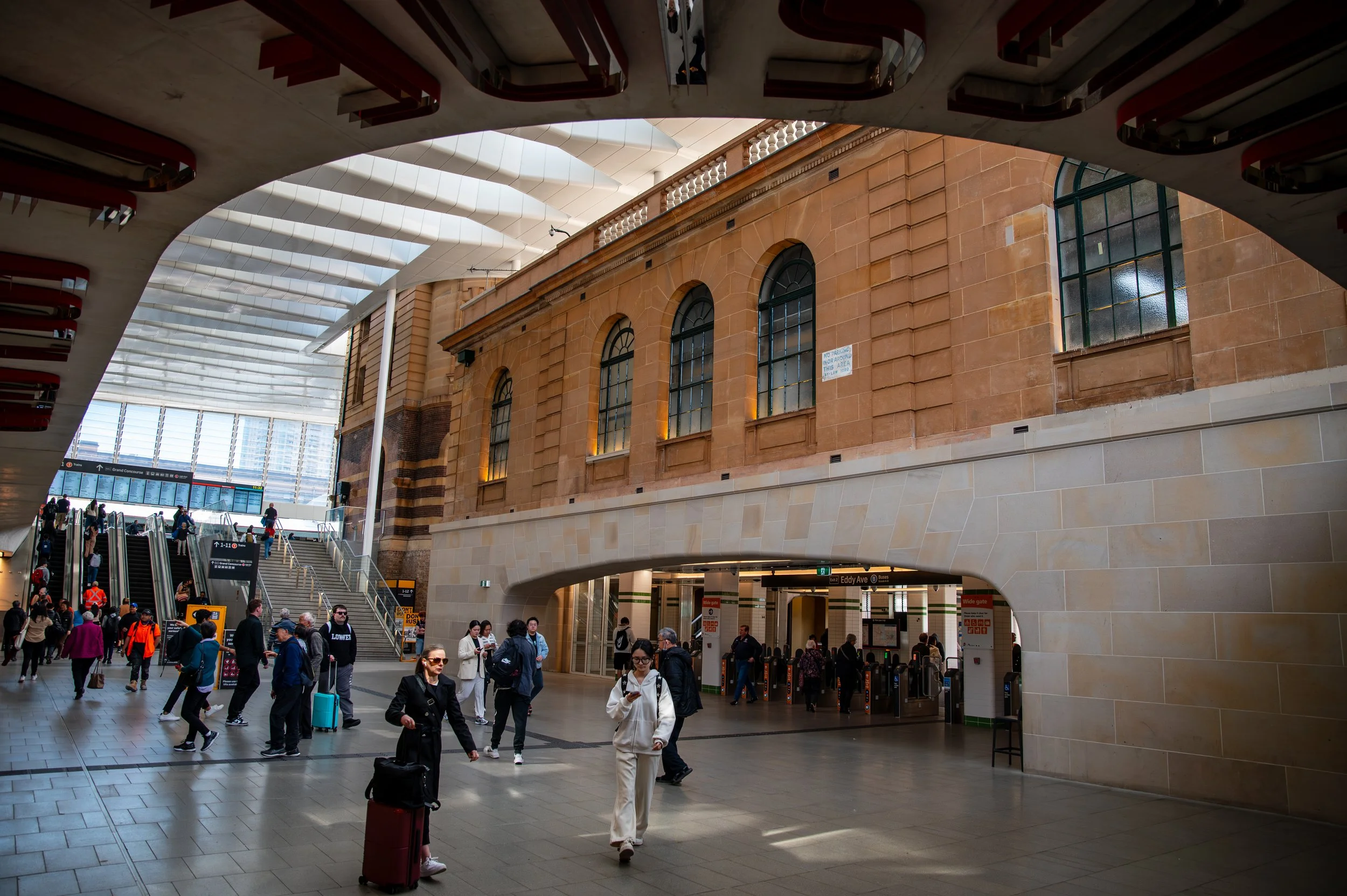 Inside a busy train station with people walking and carrying luggage, featuring escalators, modern architecture, a textured ceiling, and historical brick building elements.