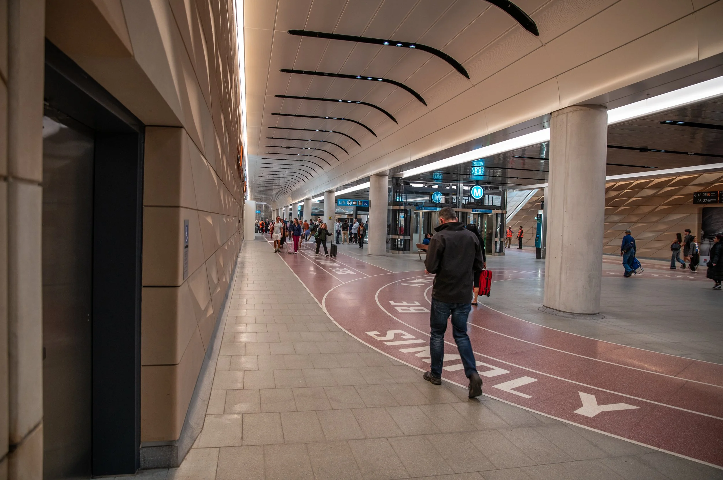Interior of a modern airport terminal with people walking and waiting near the train or subway station entrance.