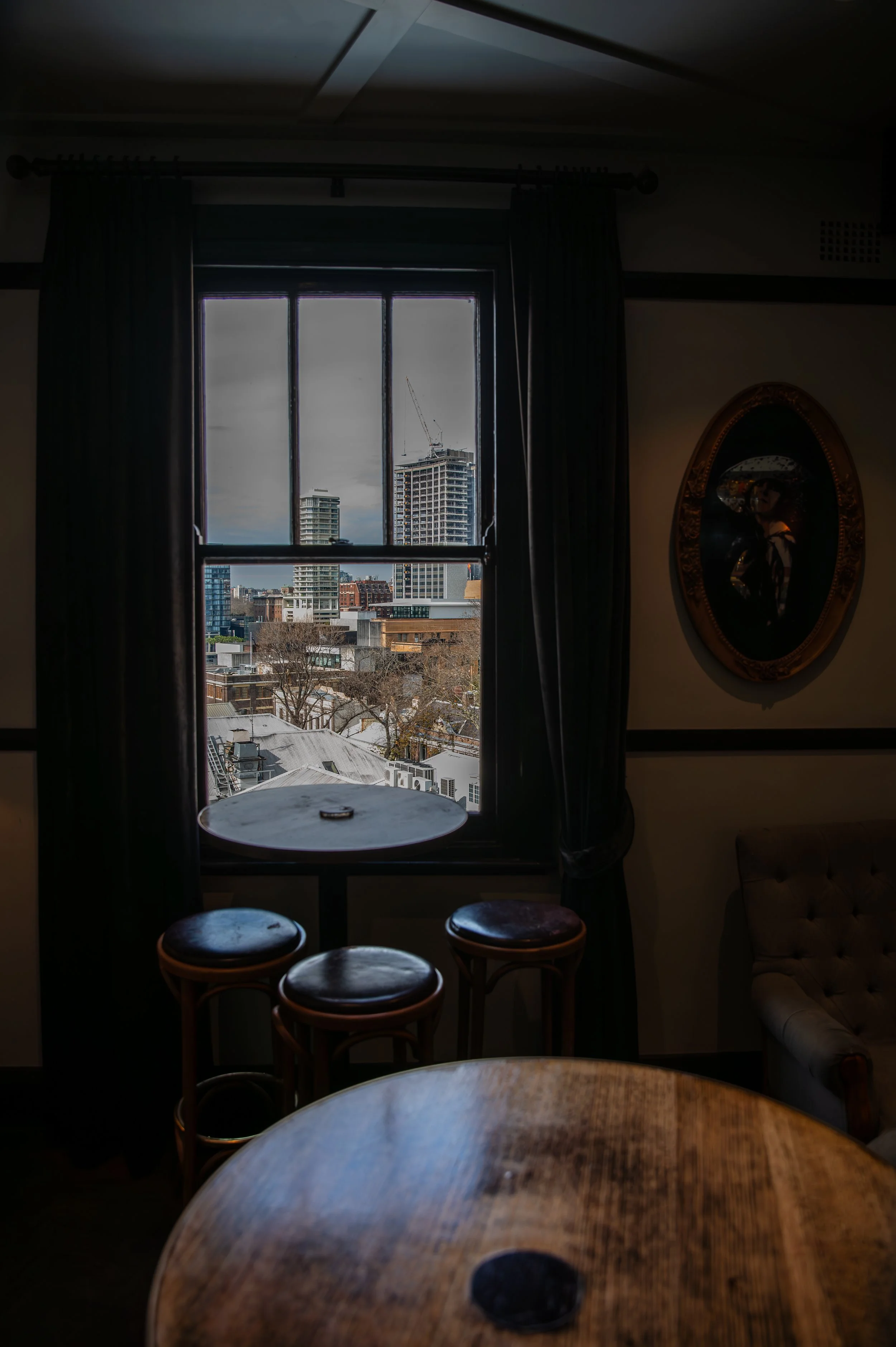 Indoor scene with a round wooden table and three bar stools near a window showing a cityscape with tall buildings and a construction crane.