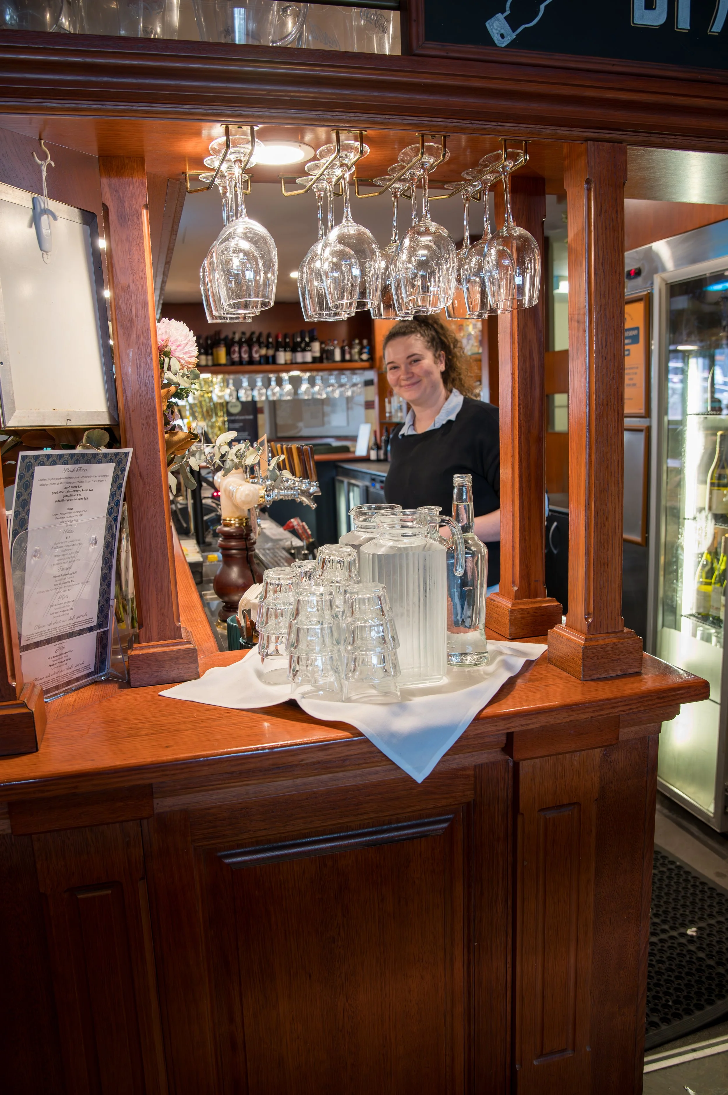 A smiling woman behind a wooden bar counter with upside-down wine glasses hanging above and empty glasses and a water pitcher on the counter.