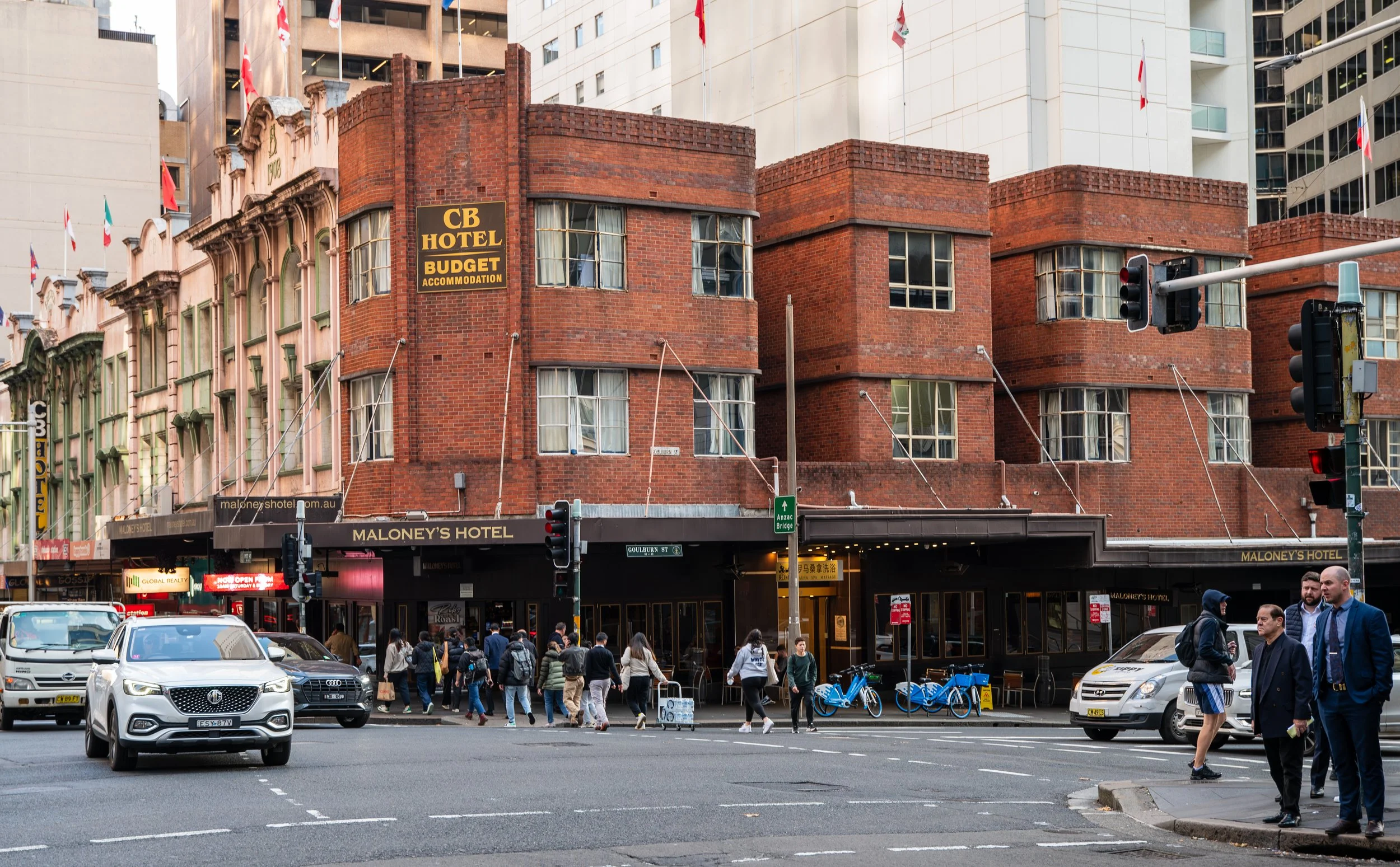 Street view of Maloney's Hotel, a multi-story brick building with a black sign, located at the corner of a busy city intersection with pedestrians crossing and cars parked and moving.