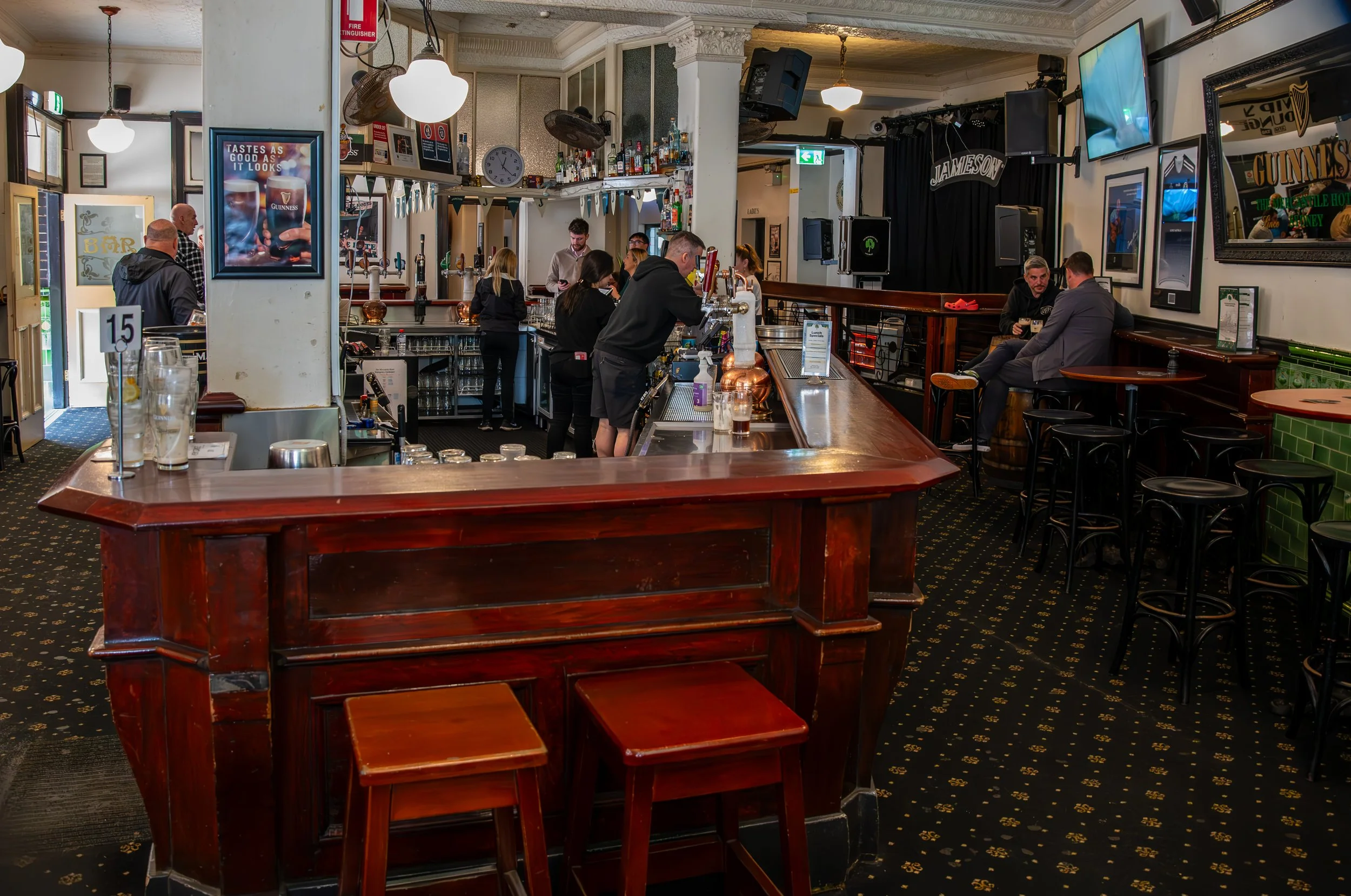 Interior of a pub with a wooden bar, bartender, and patrons sitting and standing; beer taps, bar equipment, and TV screens are visible, along with wall decorations and framed pictures.