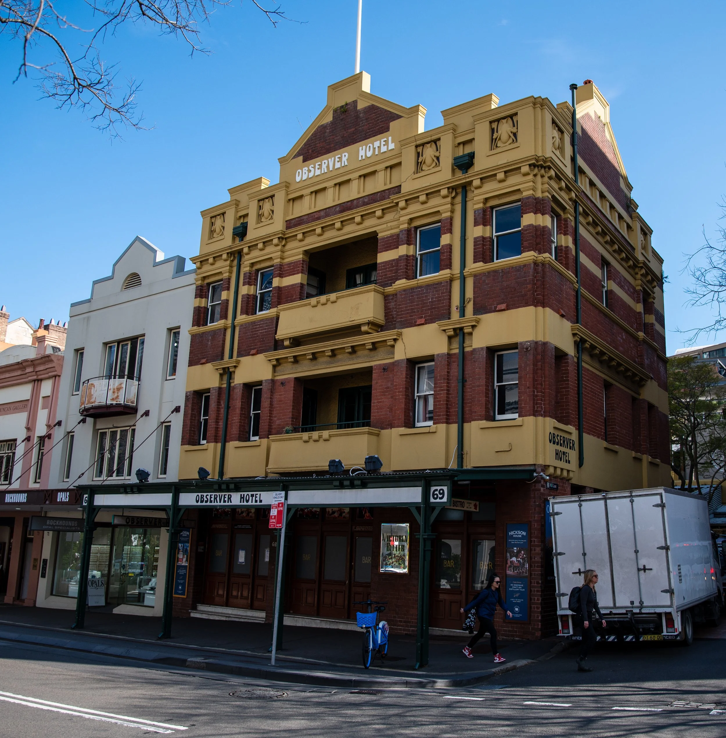 A multi-story building with a sign that reads 'Observer Hotel' on the top, featuring a yellow and red brick facade and a storefront with the same name on the ground level. Pedestrians walk past, and a truck is parked nearby under a clear blue sky.