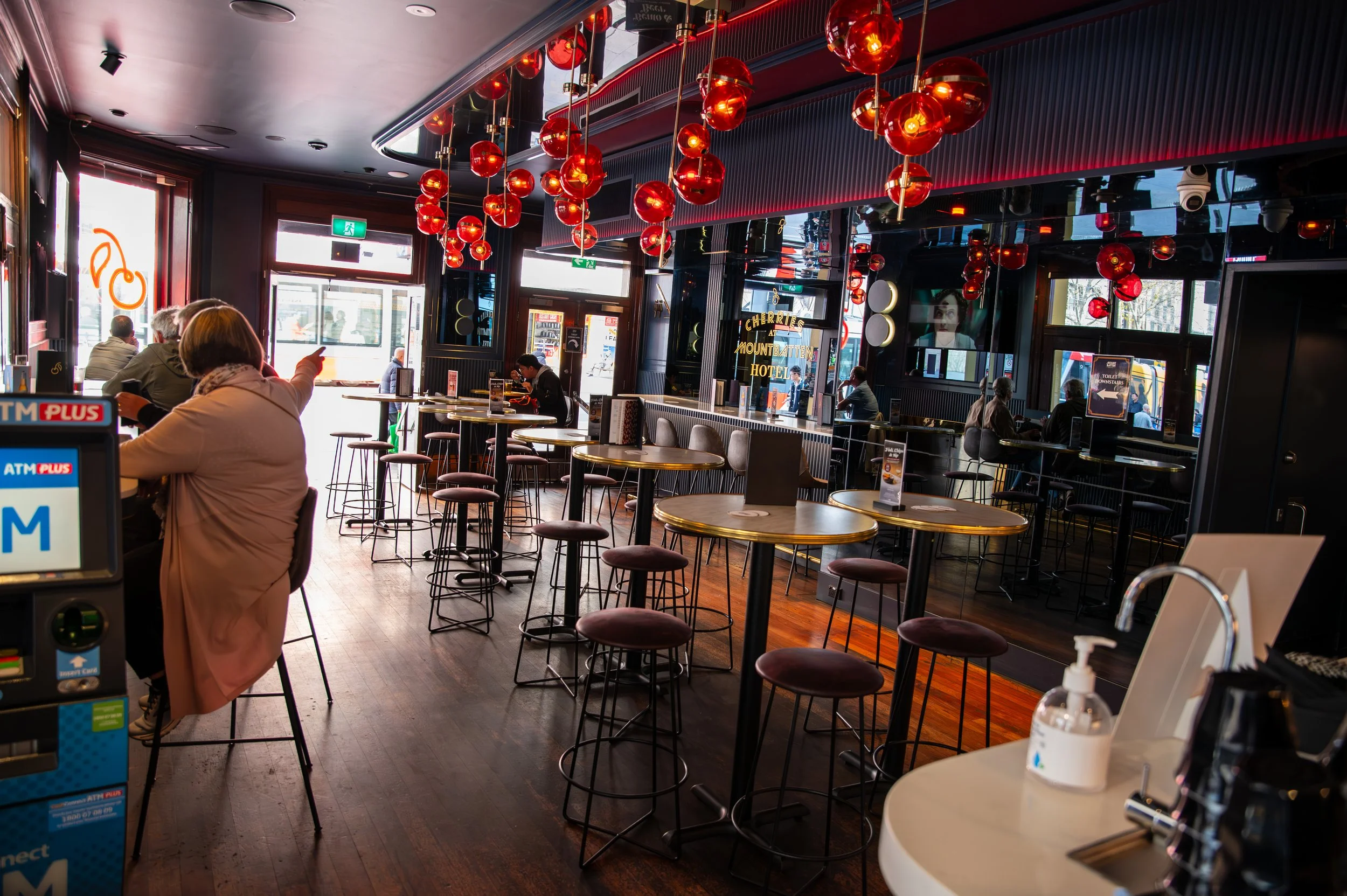 Interior of a lively restaurant or cafe with patrons seated at tables and bar, large round digital screen hanging from ceiling, bright lighting, windows, and decorative interior design.