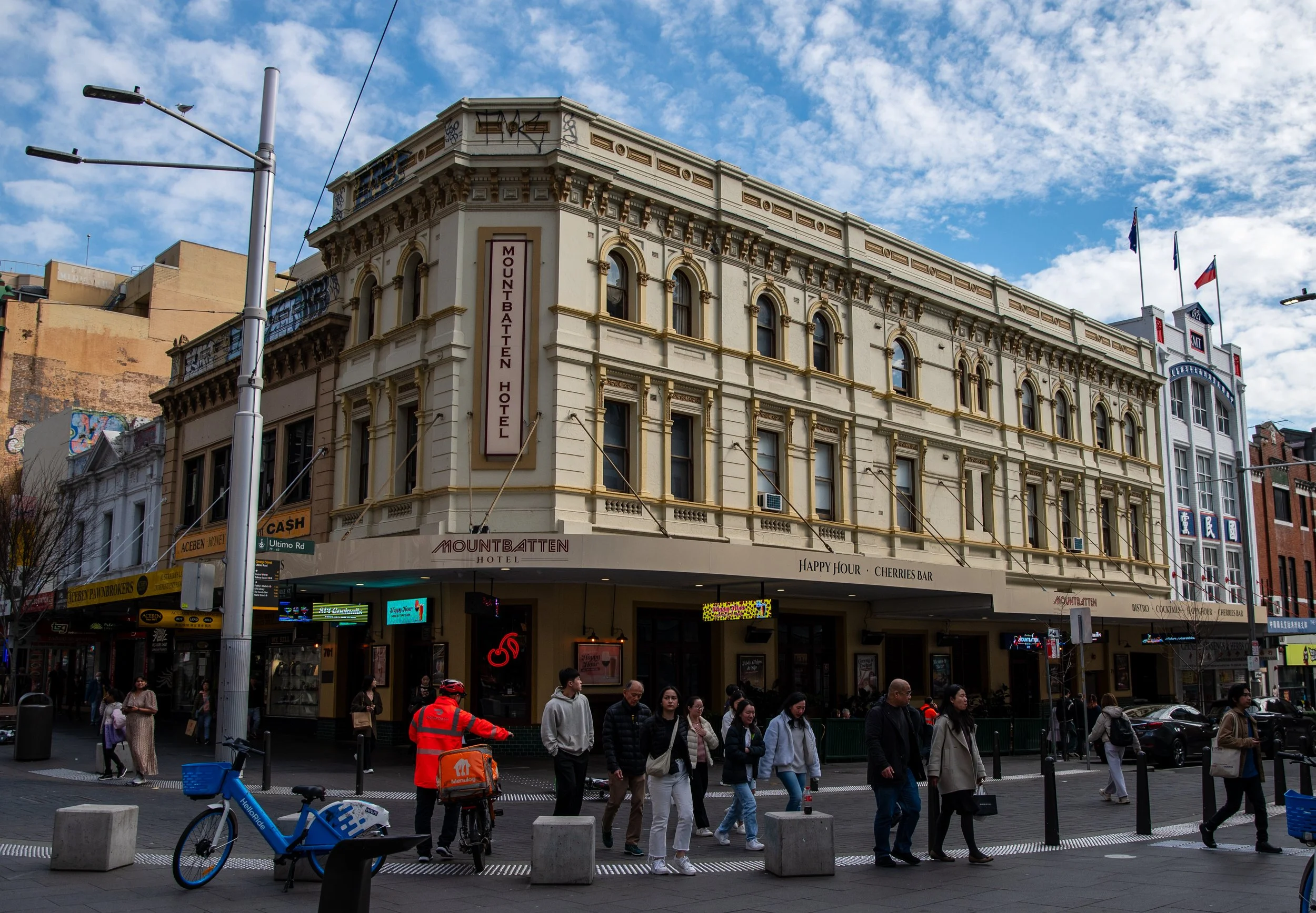 Street scene with pedestrians walking past the Mountbatten Hotel, a historic building, with signs for Happy Hour and Cherry's Bar. There are bikes and a person in a bright red jacket in the foreground. The sky is partly cloudy.