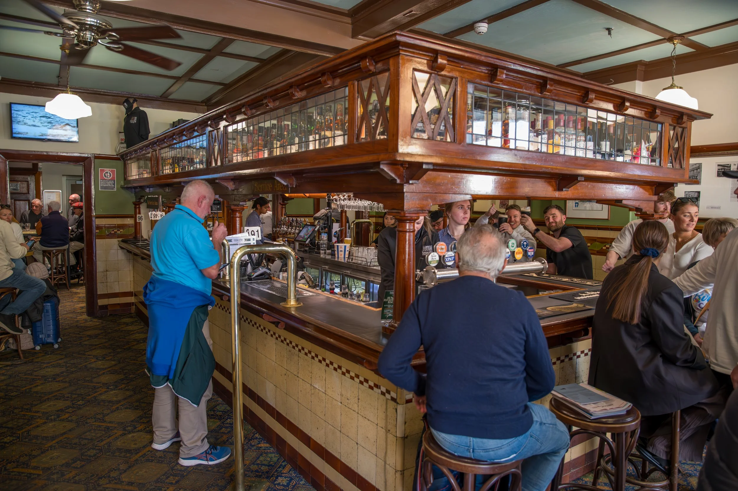 Interior of a bar or pub with patrons seated at the counter and tables, a bartender serving drinks, and natural light coming through the windows, featuring wooden furniture and pub decor.