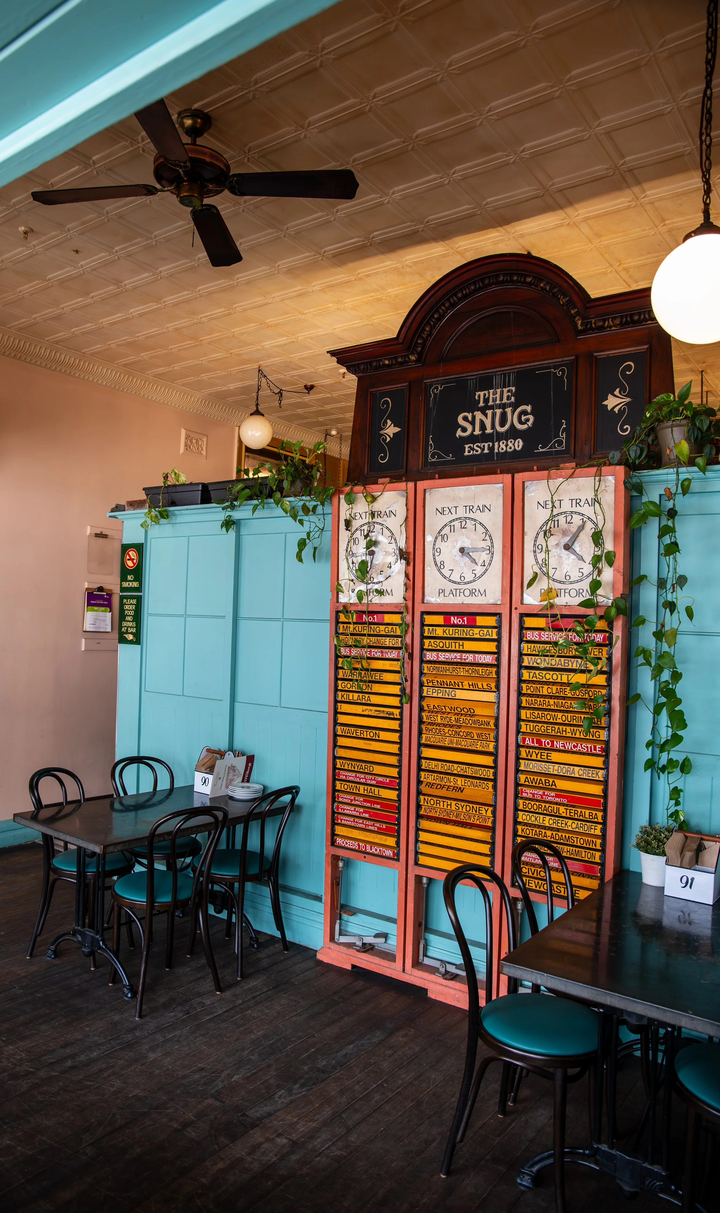 Interior of a cozy cafe with a front door labeled 'The Snug', potted plants, tables and chairs, and signs indicating no smoking and food and drinks at bar.