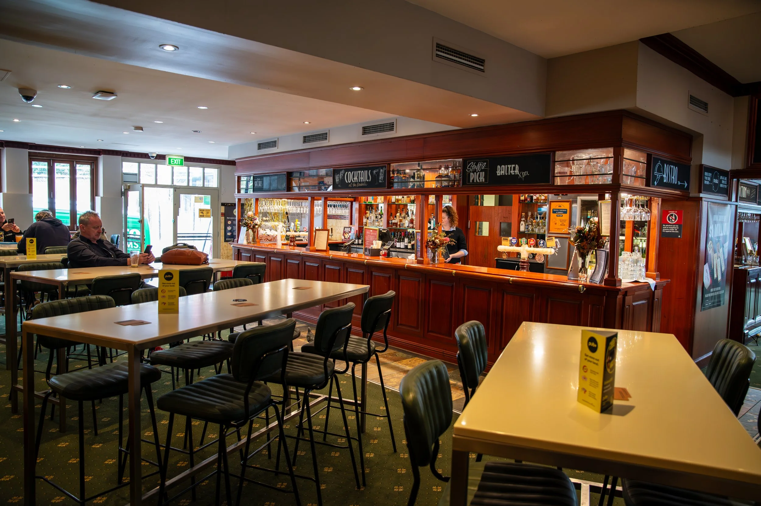 Inside a pub or restaurant with a bar counter, drink glasses, and several patrons and staff. A 'No Service Area' sign is visible on the bar. Natural light coming from the entrance doors at the back.