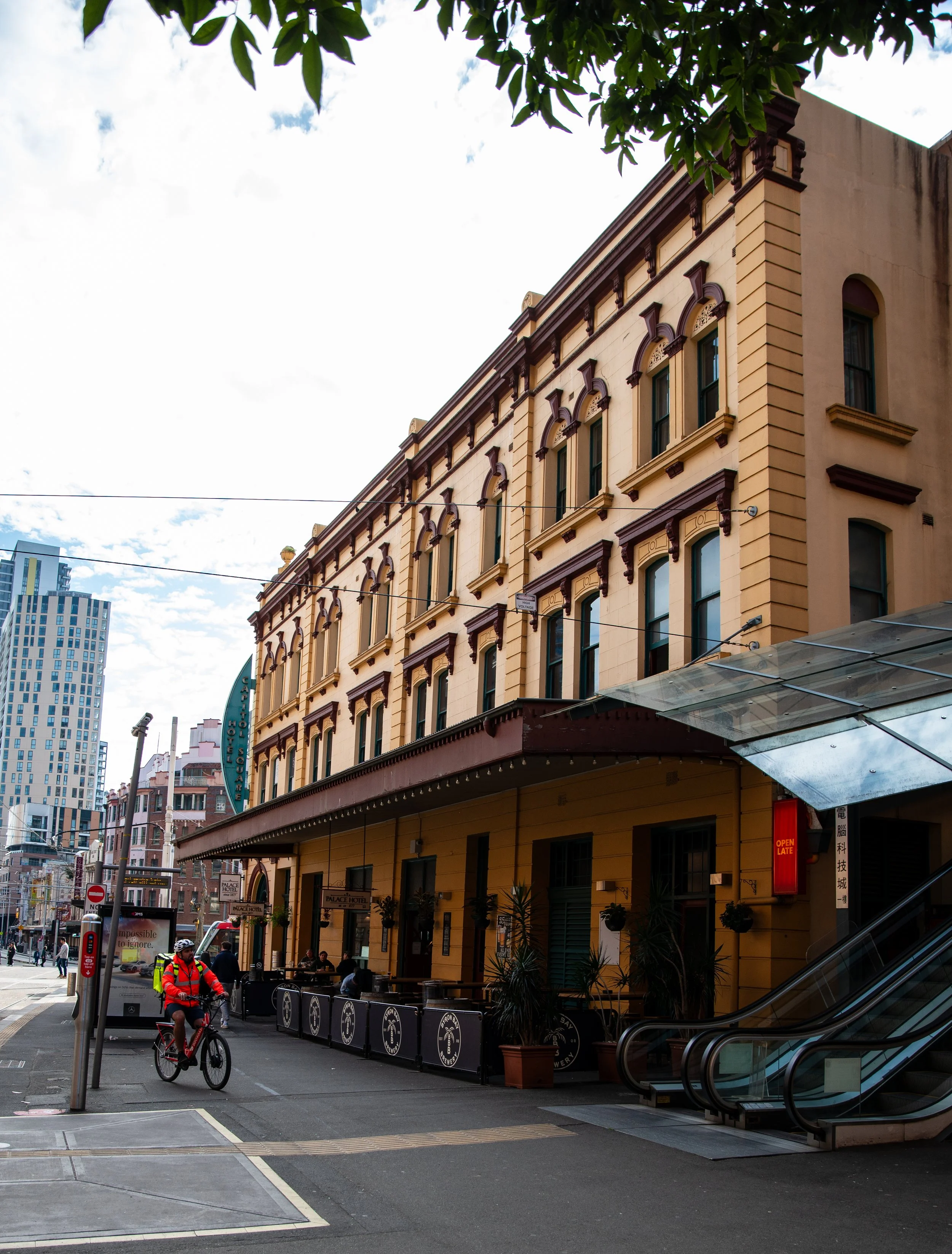 A city street scene with a yellow historic building, including an outdoor seating area, escalator, and a cyclist in a safety vest. Tall modern buildings can be seen in the background under a partly cloudy sky.