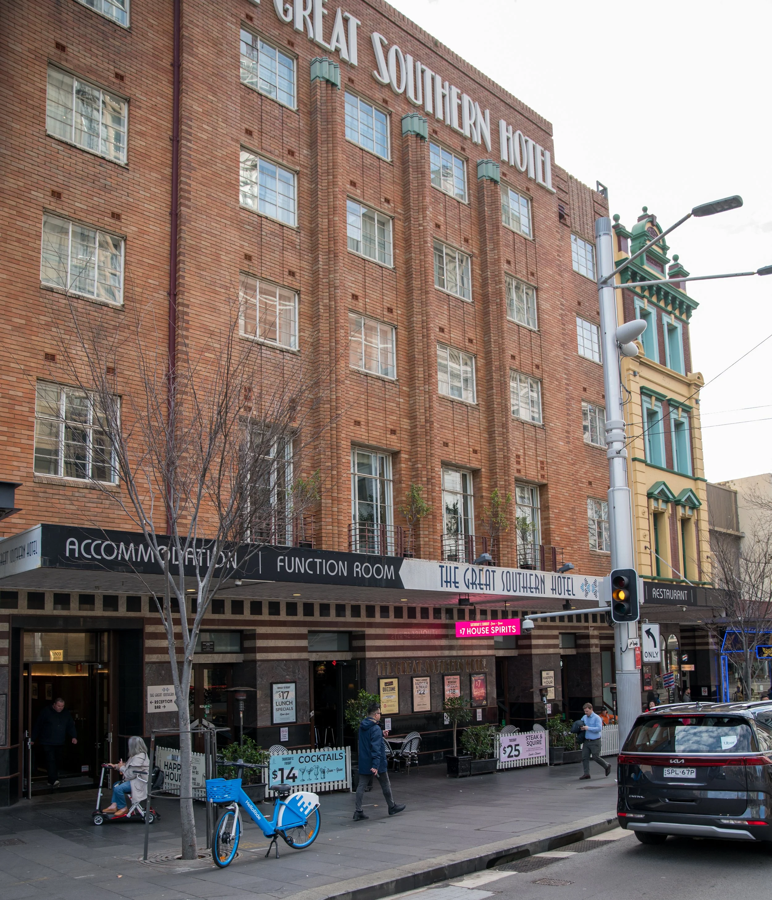 The Great Southern Hotel building with signs for a restaurant and function room, people walking on the sidewalk, parked cars, and a blue bike outside.